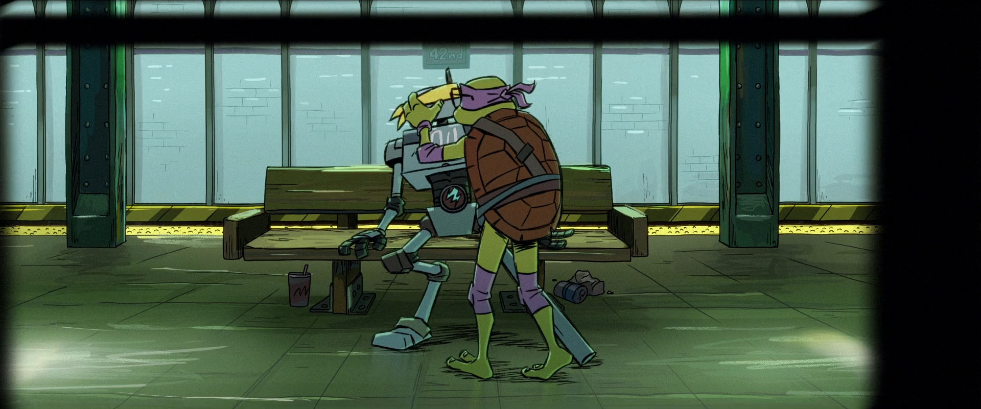 Donatello en profitait pour subtiliser les clés et retirer ses menottes. Sur le moment de partir, il voyait que les policiers se faisaient agresser par le Mechazoid en retour. Il ne pouvait s’empêcher d’attirer son attention. C’était après lui que le robot en avait après tout ! Attiré par le mutant, il le suivait dans les couloirs du métro. La tortue détalait à toute vitesse en direction de la rame la plus proche, non sans effrayer les personnes alentours.