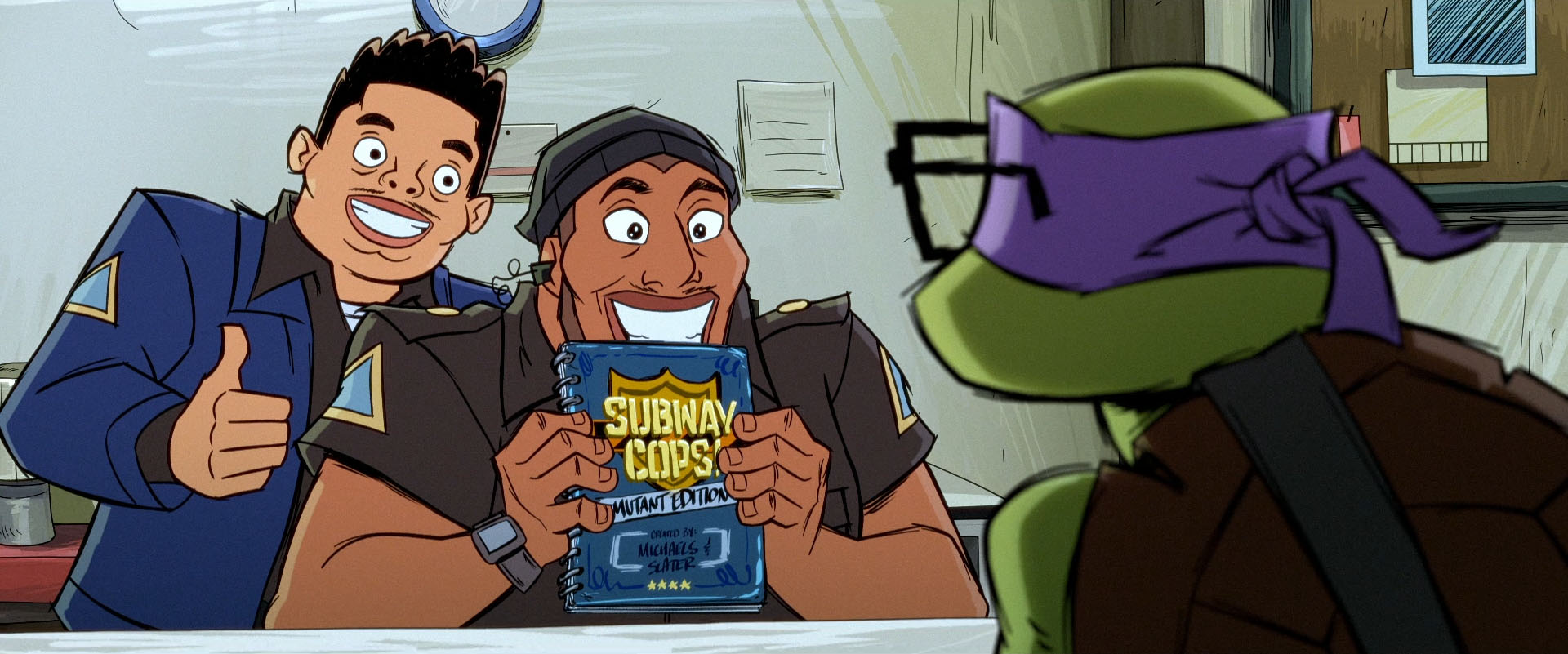 La tortue sortait du wagon avec les restes du Mechazoid vaincu. Il voyait arriver les deux policiers, la jambe de son ennemi entre leurs mains. Sans perdre de temps, Donatello leur expliquait comment retrouver Bishop pour l’arrêter. Mais les deux hommes s’en moquaient. Ils avaient assez de matière pour leur livre. Ils demandaient au mutant s’ils pouvaient juste garder la jambe du robot. Hors de question !