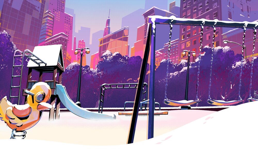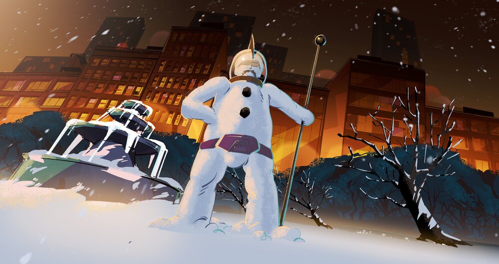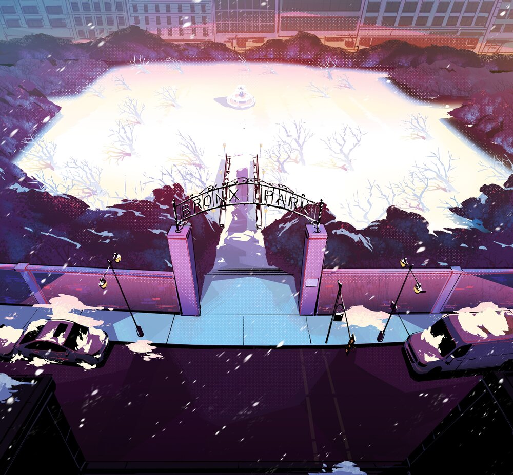 En pleine journée enneigée, les tortues, April et Mayhem jouaient dans un parc du Bronx. Les mutants réalisaient un Jupiter Jim de neige.