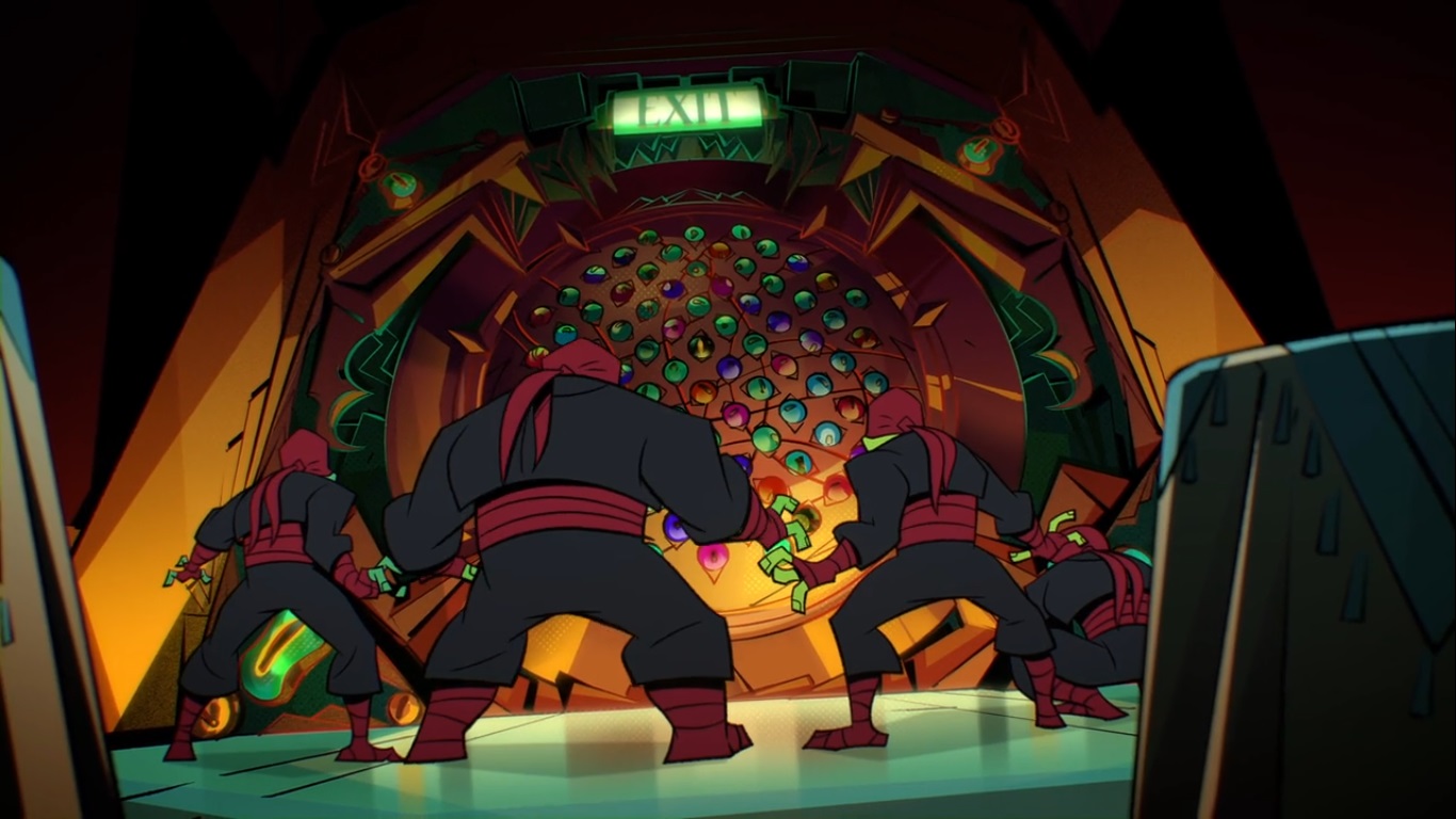 Se séparant pour trouver la solution, ils ne tardèrent pas à s’attirer des ennuis du Foot Clan, mais aussi des deux gardes de Draxum. L’un d’eux empêcha Raphael de toucher une pierre particulière. Était-ce la bonne ? La tortue se retrouva dans une salle de conférence du train avec Leonardo. Ne pouvant pas parler, ils usèrent instinctivement la télépathie pour communiquer. Ils avaient la clé pour trouver l’armure. Après avoir réunis leurs frères et April, ils appuyèrent sur la pierre défendue et arrivèrent face au Kuroi Yoroi.
