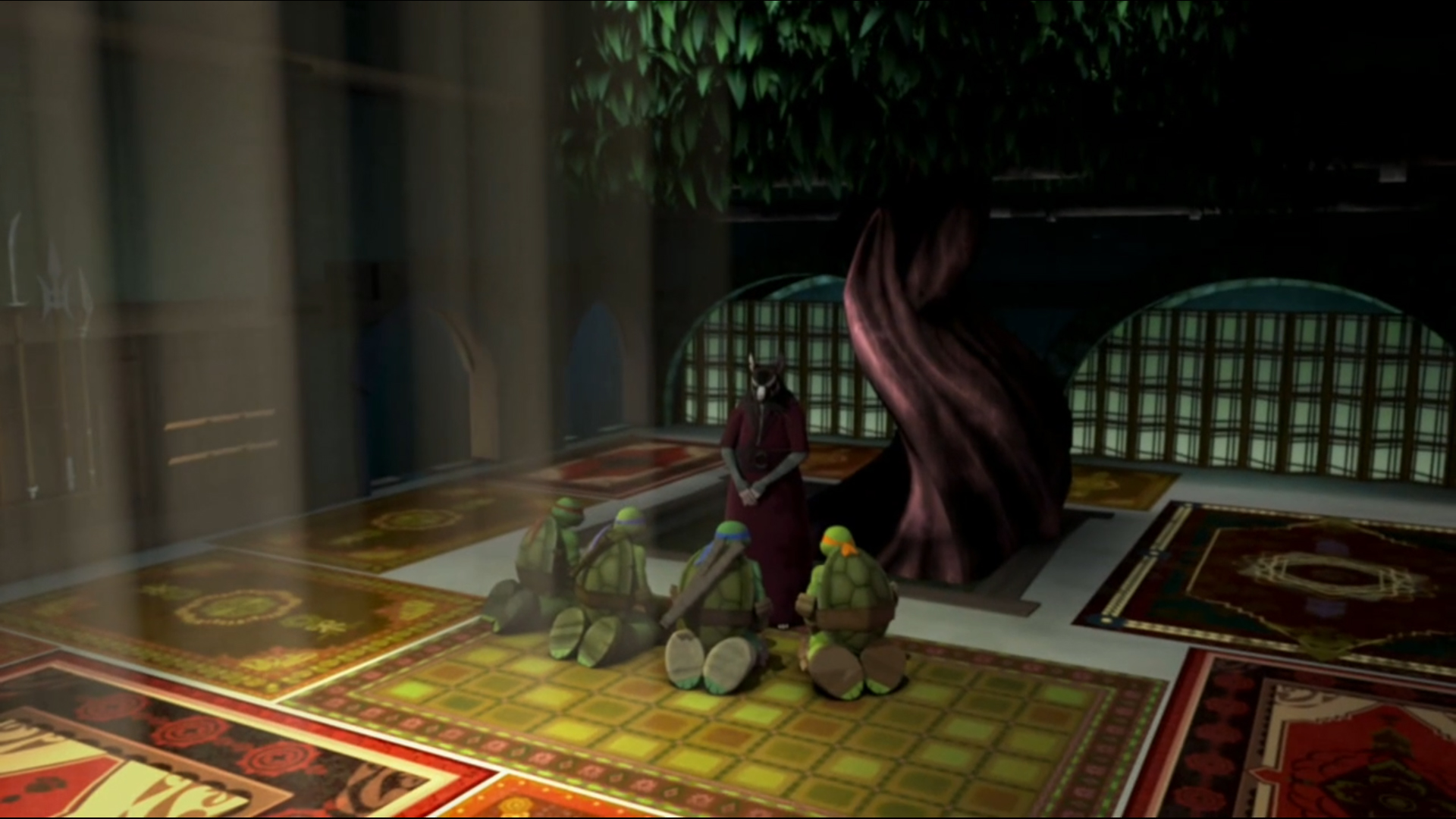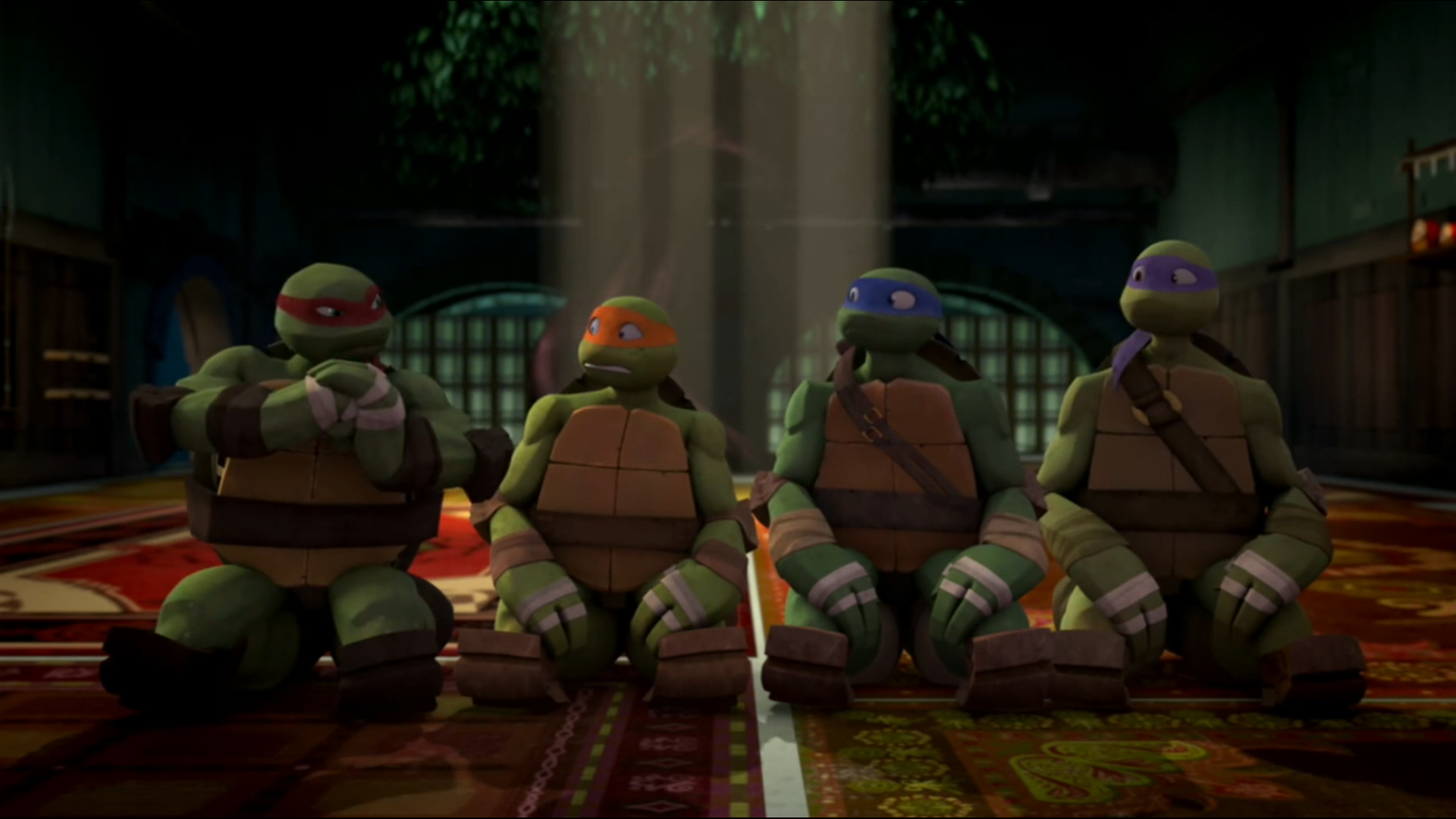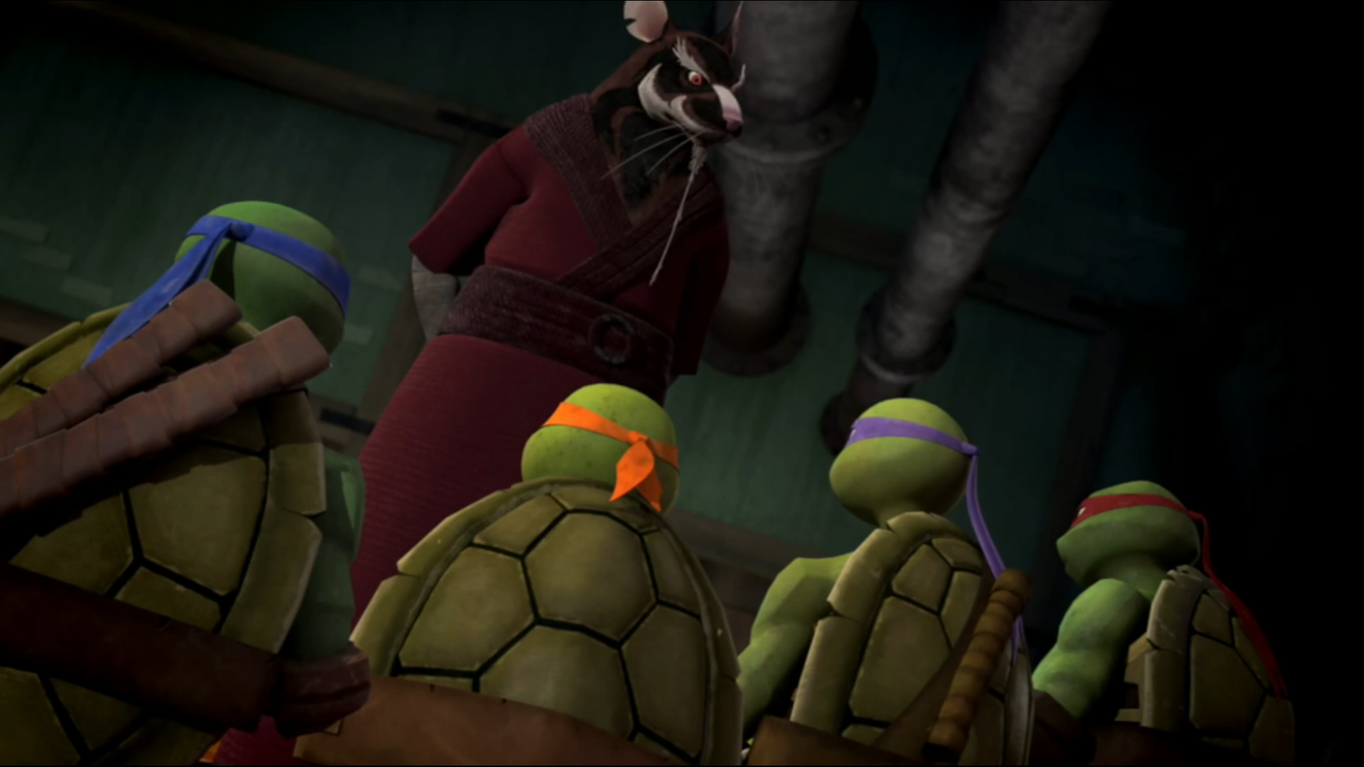 Outre le bruit, le désordre agaçait particulièrement le maître rat. Face à sa fureur contenue, Leonardo proposait qu’ils rangent le désordre et réfléchissent à ce qu’ils avaient fait. Splinter acquiesçait, c’était le minimum. Mais il pensait qu’une punition supplémentaire devait entrer en jeu. Les quatre frères étaient interdits de monter à la surface pour une semaine !
