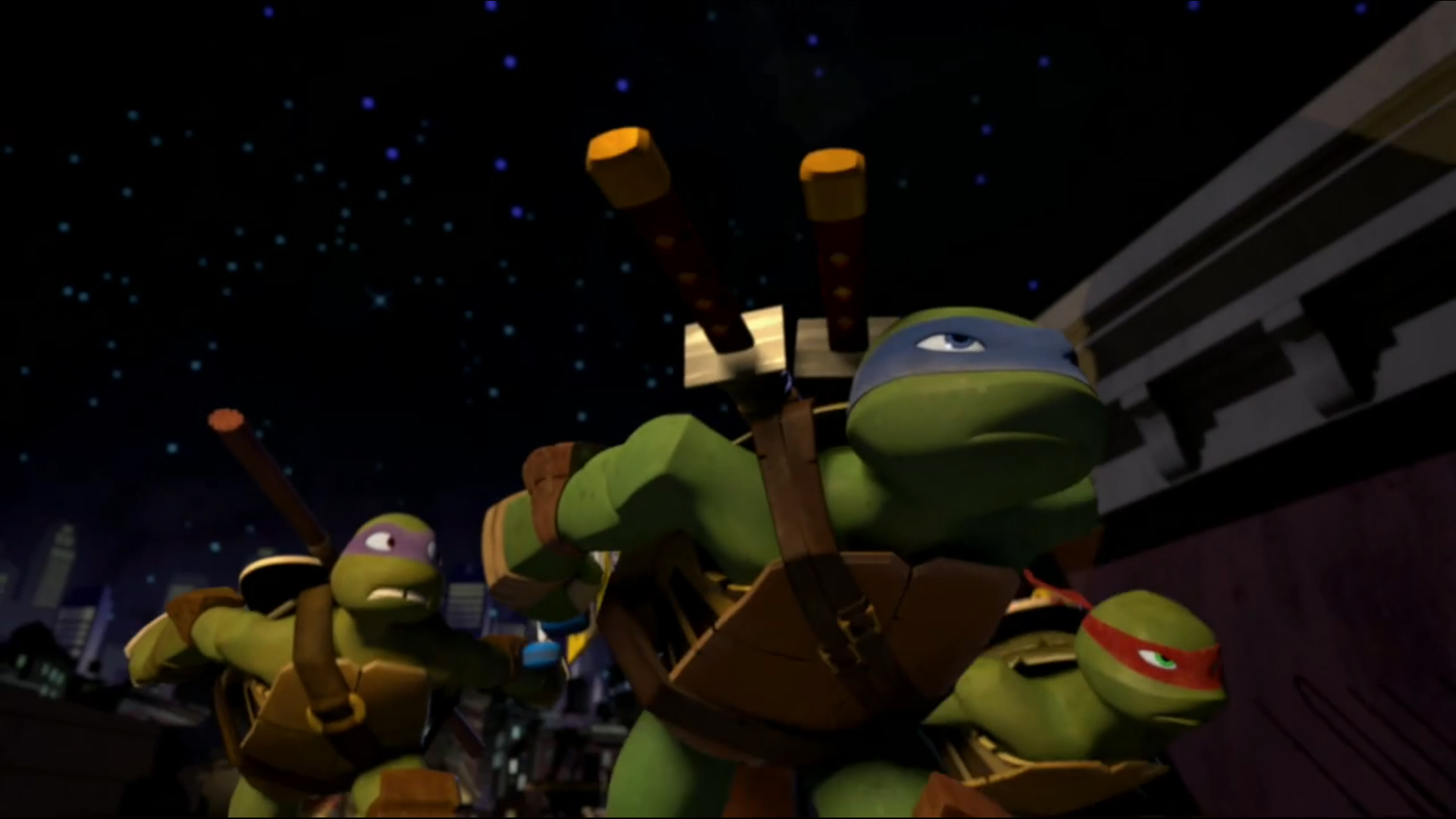 Impossible pour Splinter de se concentrer dans sa méditation. Ses élèves faisaient du boucan dans la pièce de vie. Des boîtes de pizzas gisaient au sol et trois des tortues étaient allongées au sol, en rang. Face à elles, un immense tremplin de bois et un Michelangelo monté sur son skateboard, prêt à battre le record de saut du plus grand nombre de mutants au monde ! Splinter arrivait pour demander des comptes sur ce raffut. Les trois tortues se relevaient au même moment, surprises. Inévitablement, Michelangelo les percutait.