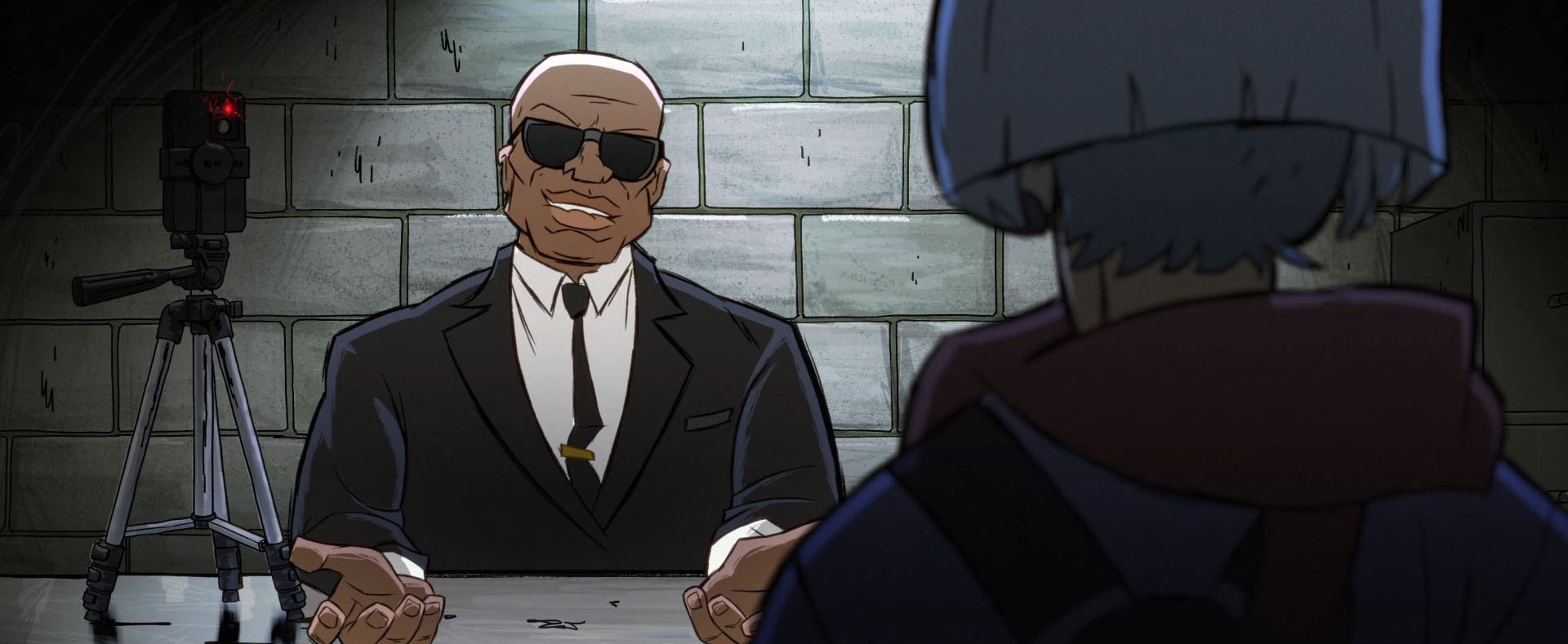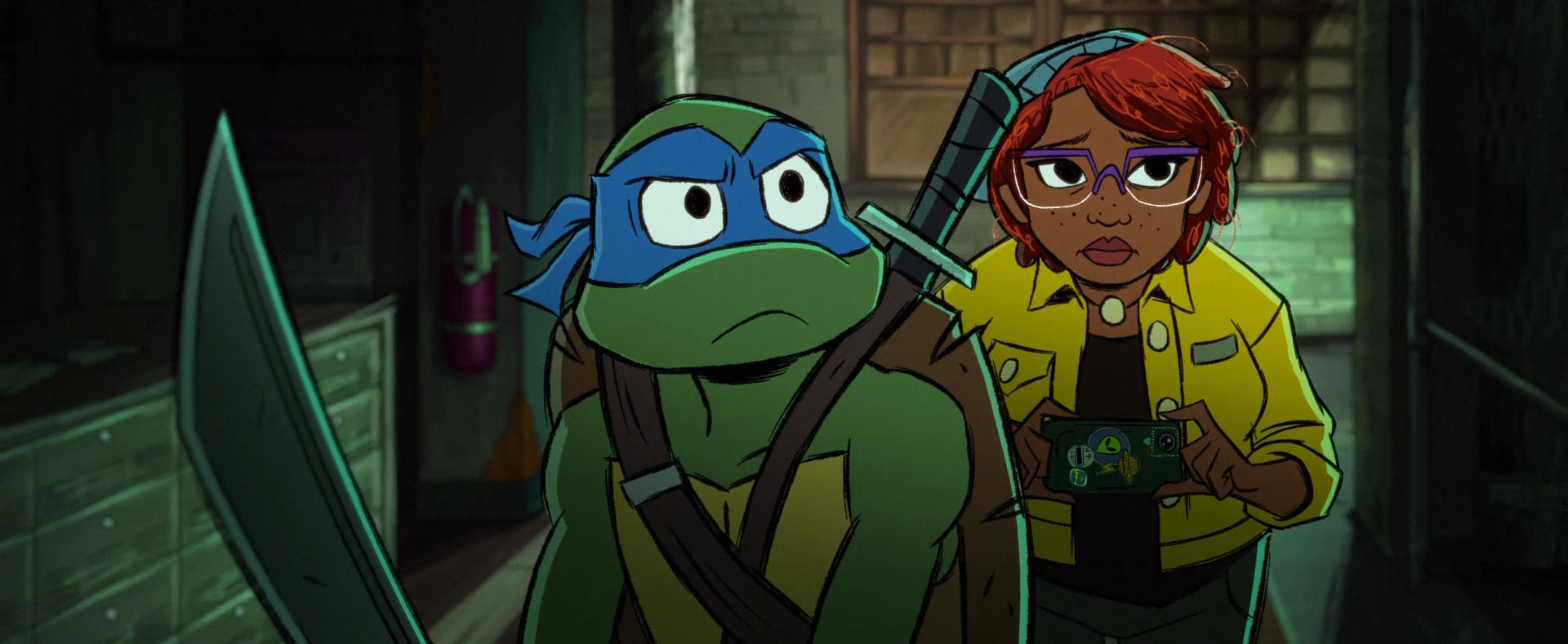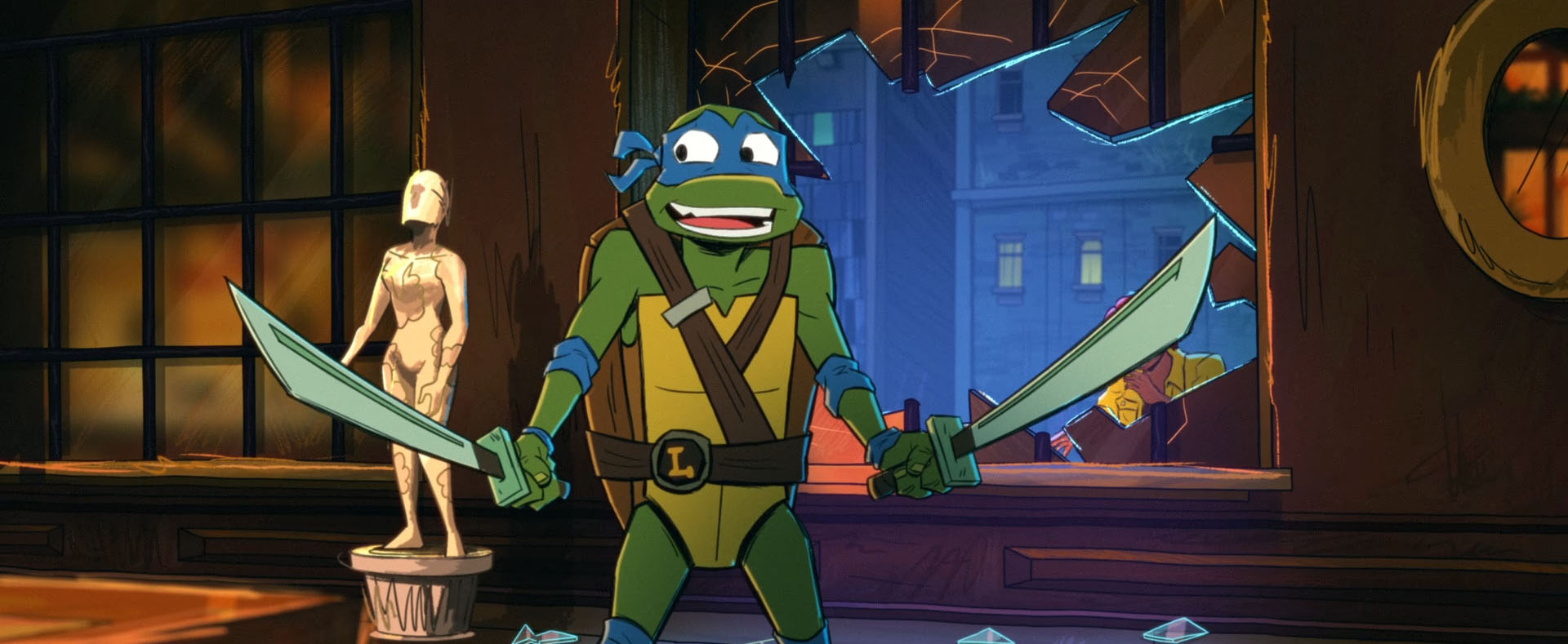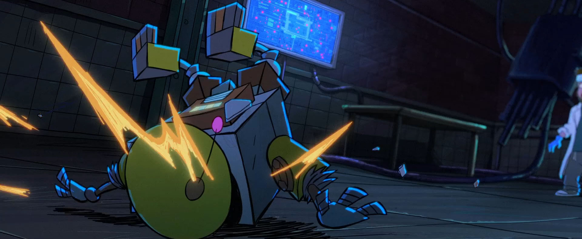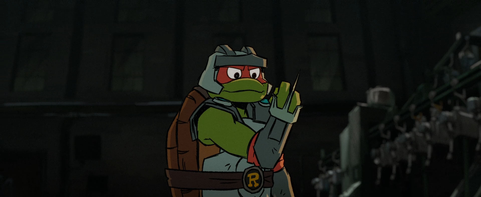 Soudain, les trois intrus entendaient une voix féminine raisonner dans les couloirs. Bishop s’adressait à eux. De quoi donner la frousse à Leonardo. Raphael était sur ses gardes, mais prêt à en découdre. La voix lui demandait s’il ne se souvenait pas de ce lieu. Il s’agissait du laboratoire détruit par SuperFly. Un bâtiment parmi tant d’autres ce soir-là en réalité (Mutant Mayhem).