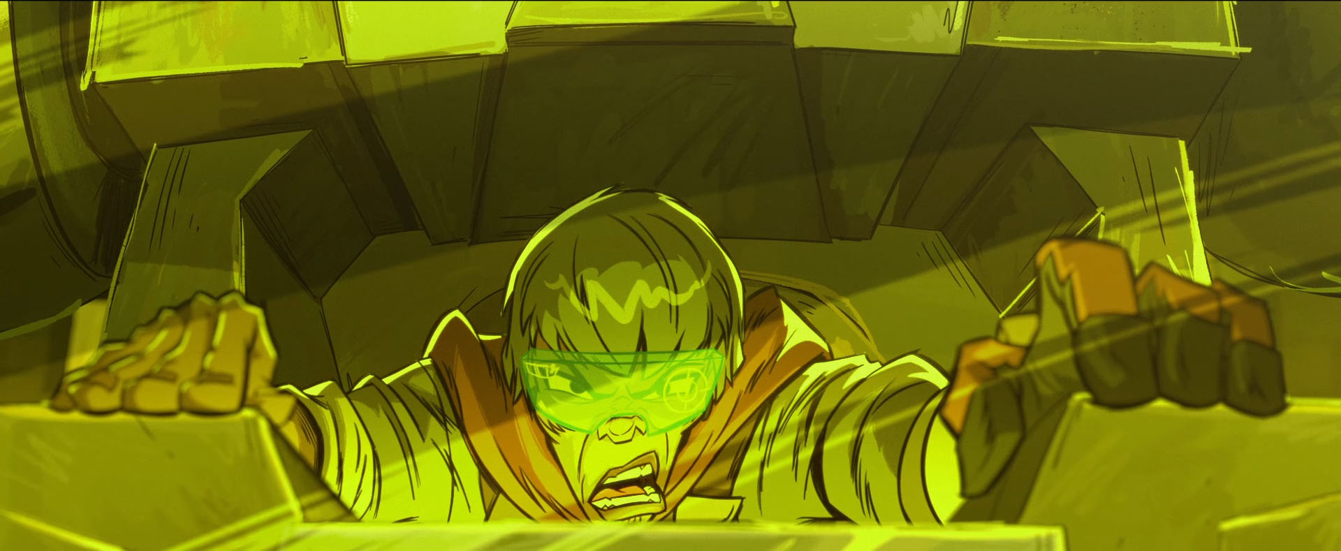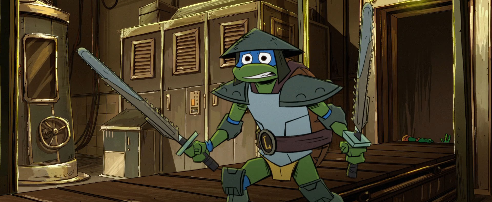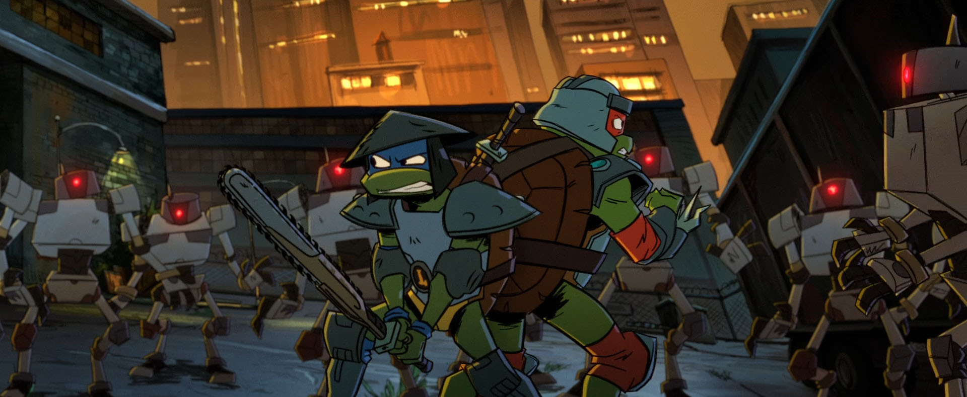 Finalement, Leonardo arrivait dans un entrepôt. Le bon cette fois ! April, qui le suivait, lui avait garanti que le restaurant n’était pas le bon endroit. Il avait eu raison de l’écouter – un peu trop tard. Pénétrant dans le lieu par une baie brisée il se voulait le plus discret possible. Le moindre bruit le faisait sursauter. On ne peut pas dire que ce que lui disait April le rassurait. Une attaque massive de Mechazoids venus de l’ombre… Raphael avait également trouvé le bon endroit et essayait d’entrer depuis les toits. Avec une manière bien moins subtile et plus bruyante. Il défonçait la porte.