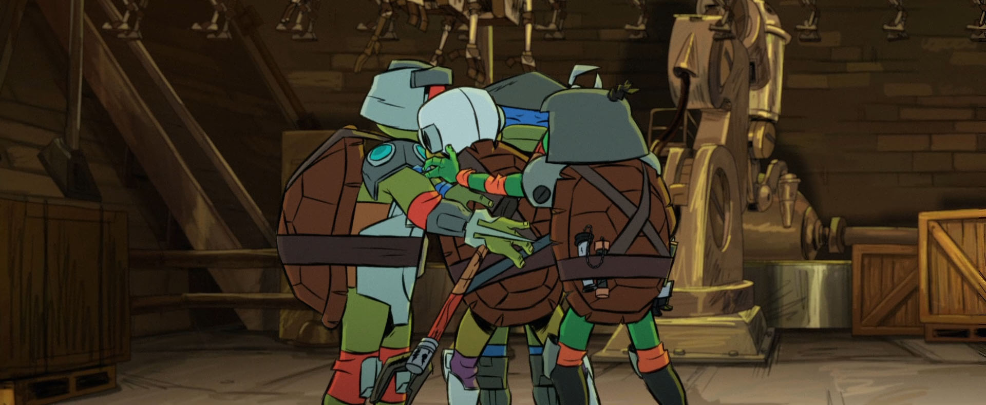 Le combat contre le robot géant était des plus rudes. Malgré sa force et sa violence, Raphael ne parvenait pas à en venir à bout. Ils entendaient la voix d’April les prévenir que d’autres Mechazoids étaient en approche. Soudain, une baie vitrée se brisait, laissant apparaître Pigeon Pete et Michelangelo qui trainait Rod derrière lui. Il n’avait pas le temps de leur présenter le volatile, simplement qu’il était à l’origine de sa mutation. Au même moment, Donatello arrivait à son tour, non sans promettre des renforts sous peu. Les quatre frères étaient enfin réunis.