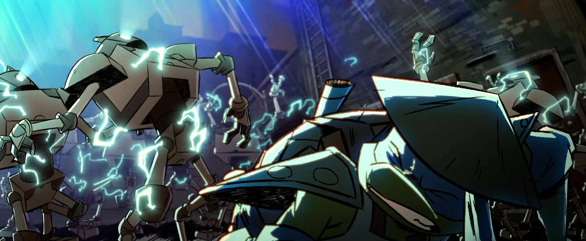Avec ce renfort, les tortues étaient certaines de l’emporter. C’est alors que les lumières de l’entrepôt se coupaient et tous les Mechazoids de la chaîne de montage s’activaient. Des dizaines de ces machines se lançaient sur les mutants puis déferlaient dans les rues de la ville. Les Mechazoids s’en prenaient au restaurant à proximité, faisant fuir les clients.