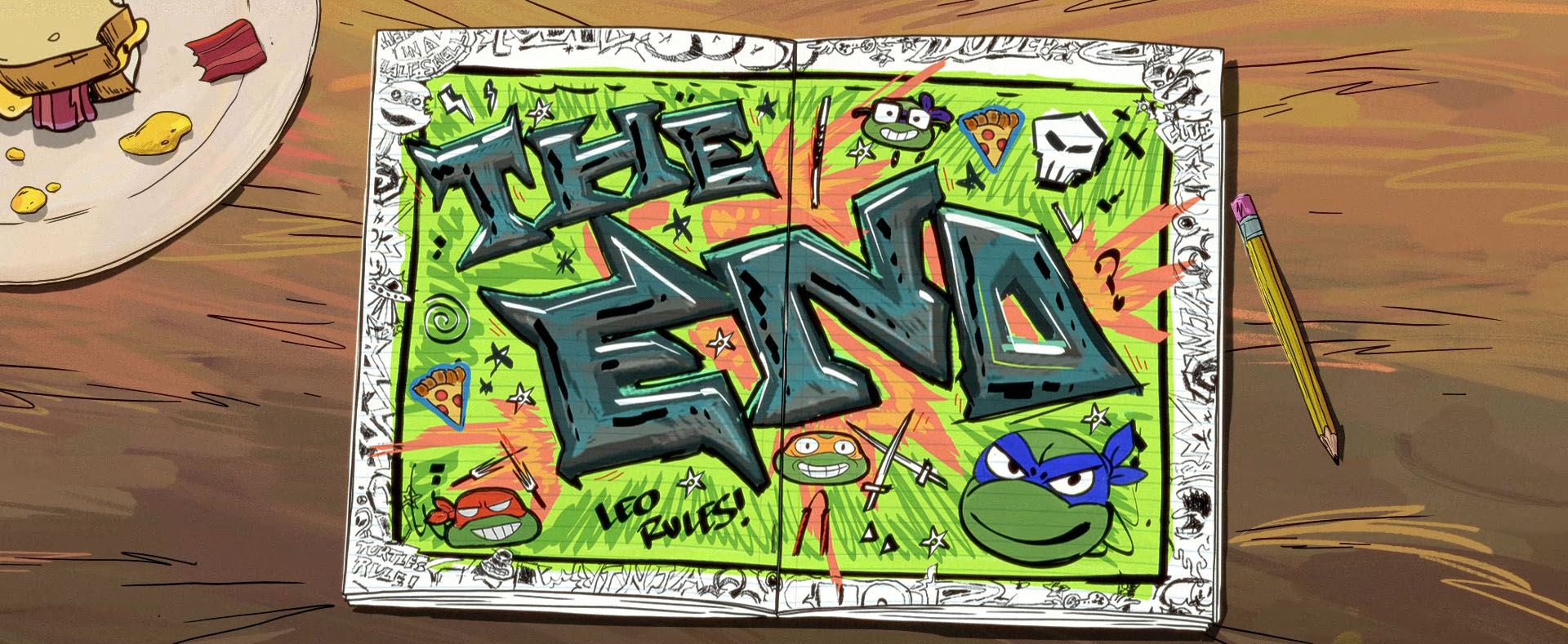 La dernière page de la bande dessinée de Leonardo présente quelques easter eggs. Nous pouvons voir dans la marge, à proximité du T de The end une tête de sorbet tortue, référence aux glaces américaines des années 90’ de Popsicle. Nous pouvons également voir une tête de mort, qui pourrait être également un clin d’œil au masque de Casey Jones.