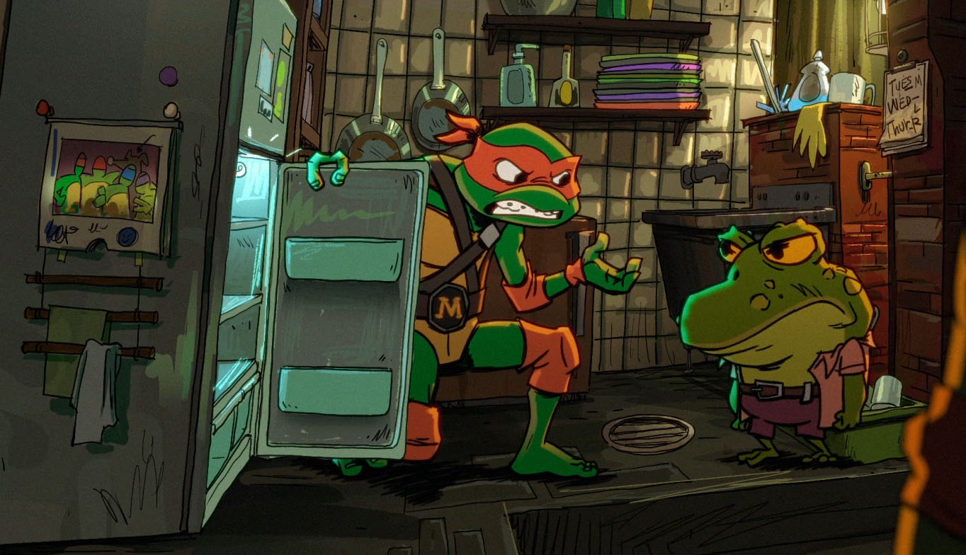Assis sur un coussin, la tortue cherchait le calme et la sérénité. Avec Scumbug à ses côtés, ce n’était pas gagné ! Soudain, le bruit assourdissant d’un marteau piqueur venait le sortir totalement de ses gonds. La tortue mettait le repaire totalement sens dessus dessous de rage. Il s’en prenait même à Leonardo, qui n’avait rien demandé ! Les autres Mutanimals commençaient à se battre, pensant qu’il s’agissait d’un jeu. Splinter arrêtait sur le champ cette querelle. Les tortues, qui avaient grandi dans un lieu stable, devaient montrer l’exemple à leurs cousins, qui n’avaient connus que SuperFly (Teenage years). Finalement, il les autorisait à sortir. Leonardo devait faire prendre l’air à Pigeon Pete. Michelangelo était invité à partir à la supérette avec Genghis pour faire un réapprovisionnement. Pour que Splinter puisse regarder ses séries, il exigeait de Donatello qu’il répare le courant avec Wingnut. Enfin, Raphael était chargé de trouver le marteau piqueur et de le rendre silencieux. Pour cette mission, il serait accompagné de Ray Fillet et de Scumbug. La tortue s’y opposait, mais elle n’avait guère le choix. Enfin Splinter allait avoir un petit peu de silence ! Quel bonheur.