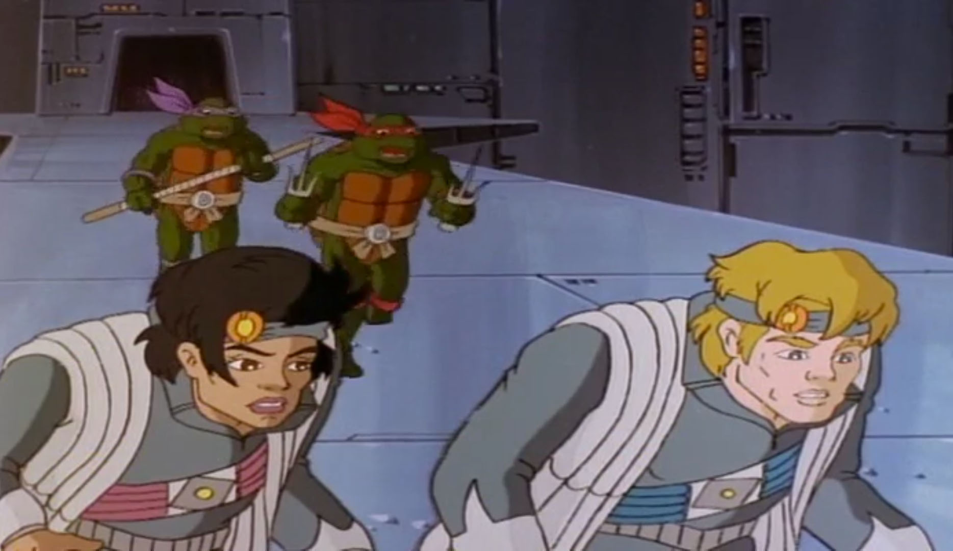 La venue de Carter dans le vaisseau de Dregg avait été de courte durée. April devait trouver une solution pour aider ses amis. Seul un garde était posté dans la pièce. Elle décidait de simuler un étouffement pour que celui-ci ouvre sa cellule. Une fois fait, elle l’électrisait à l’aide de son taser. Sans perdre de temps elle libérait les tortues. D’autres soldats arrivaient au loin. La journaliste ouvrait une grille d’aération et y faisait passer ses quatre amis en prenant le soin de refermer derrière elle.
