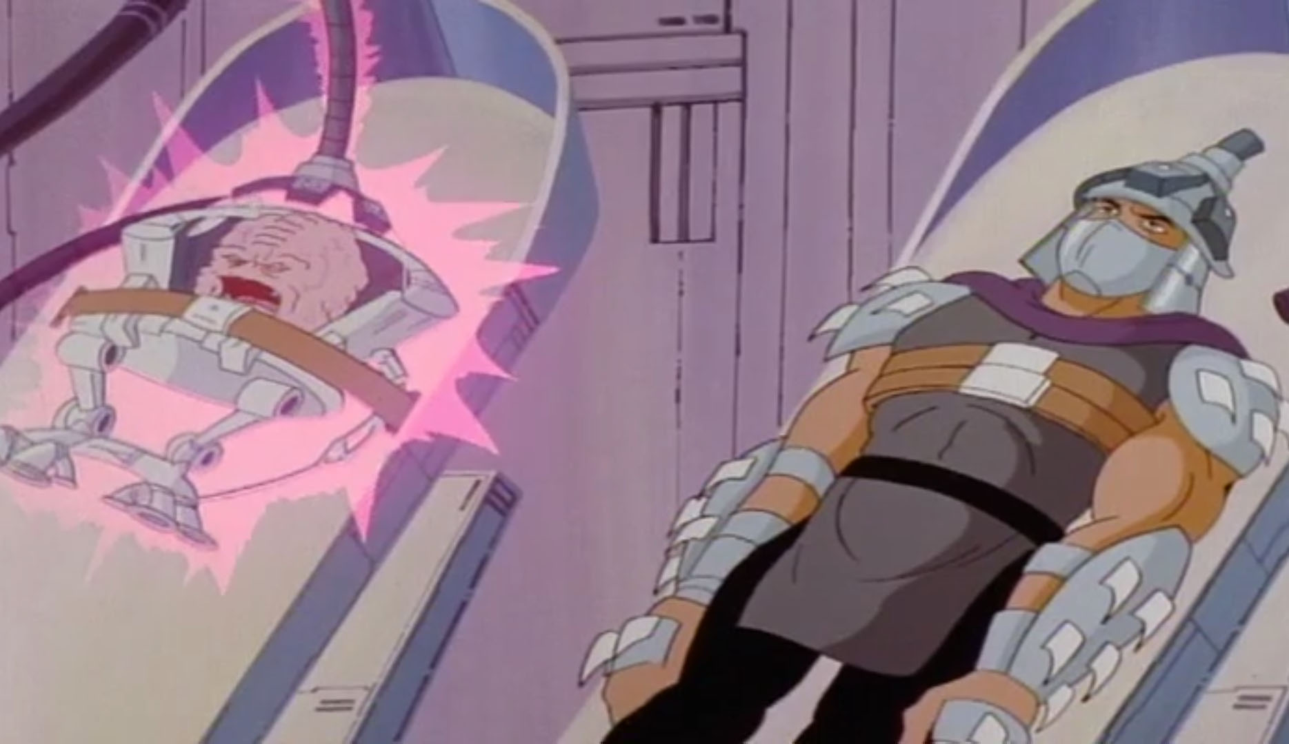 Mung annonçait que le transporteur était réparé. Ils allaient extraire de l’acier un petit peu partout autour d’eux pour construire une nouvelle machine. L’alliage était prélevé depuis le téléporteur sur les ponts, les bâtiments en construction, les voies ferrées… Les microbots n’auraient plus qu’à tout assembler de nouveau. Dans l’opération, le laboratoire où se trouvaient Krang et Shredder se faisait également frapper par le rayon. La structure privée de son armature d’acier s’effondrait sur les deux esprits maléfiques.