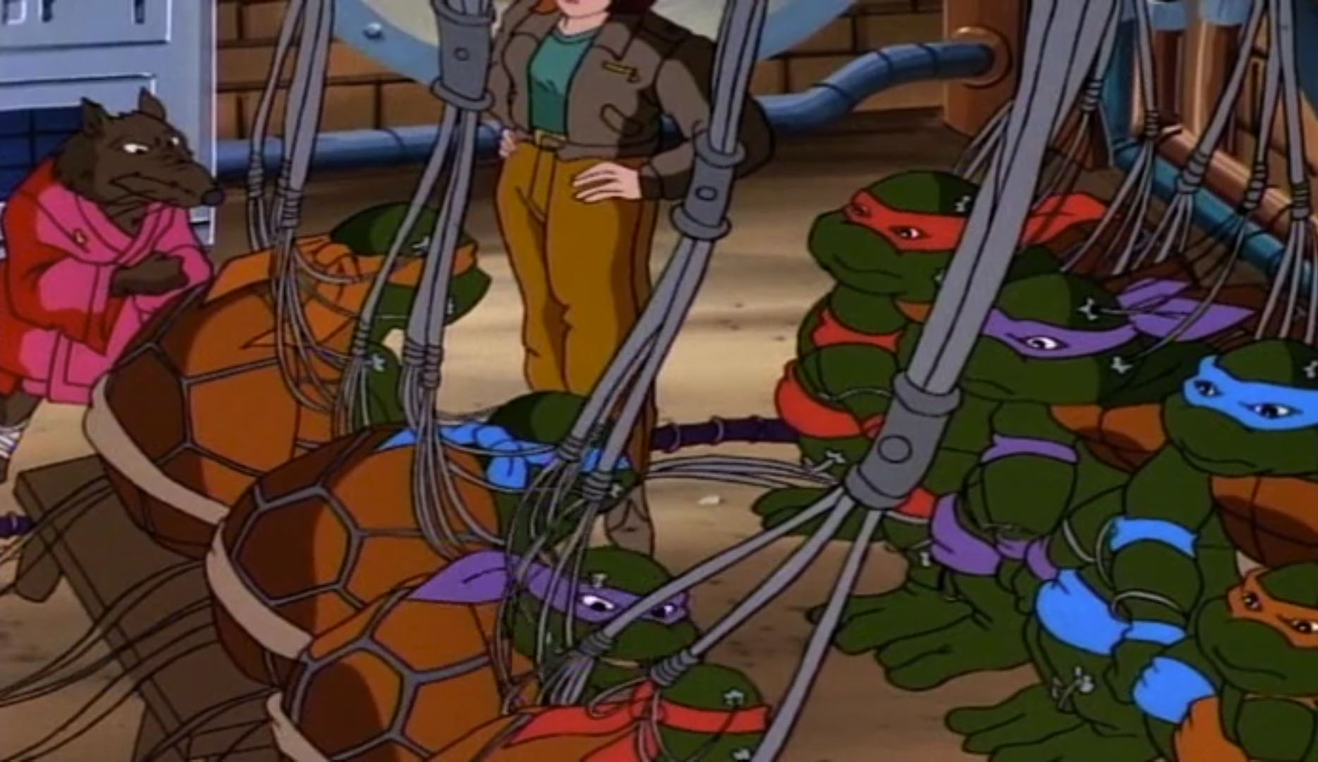 Quinze heures plus tard, la transfusion d’énergie était enfin terminée. Les huit tortues se sentaient en pleine forme. Sans vouloir trop perdre de temps, les reptiles du passé voulaient en finir avec Shredder à leur époque. Carter envoyait un message à Landor et à Merrick, mais quelque chose ne se passait pas comme prévu. L’ordinateur ne parvenait pas à envoyer la requête. Donatello commençait à s’inquiéter, il ne leur restait plus que trois heures avant de risquer le paradoxe temporel.