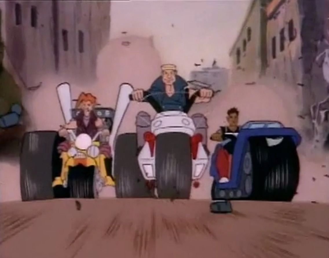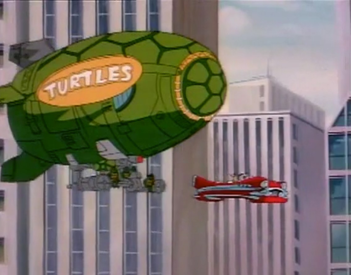Les tortues prenaient la voie des airs à l’aide du dirigeable et retrouvaient très vite la trace du véhicule volant. Mais ceux-ci n’eurent pas le temps de prévenir les reptiles ; leur voiture était touchée par un tir laser et s’écrasait au sol. Les trois passagers étaient amenés dans une fourgonnette par Bebop et Rocksteady, qui semaient sans mal le ballon des tortues à travers les rues étroites de la ville.