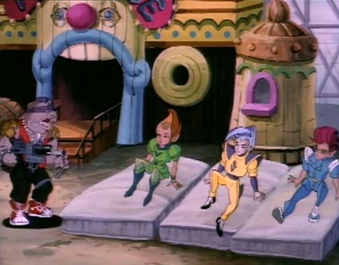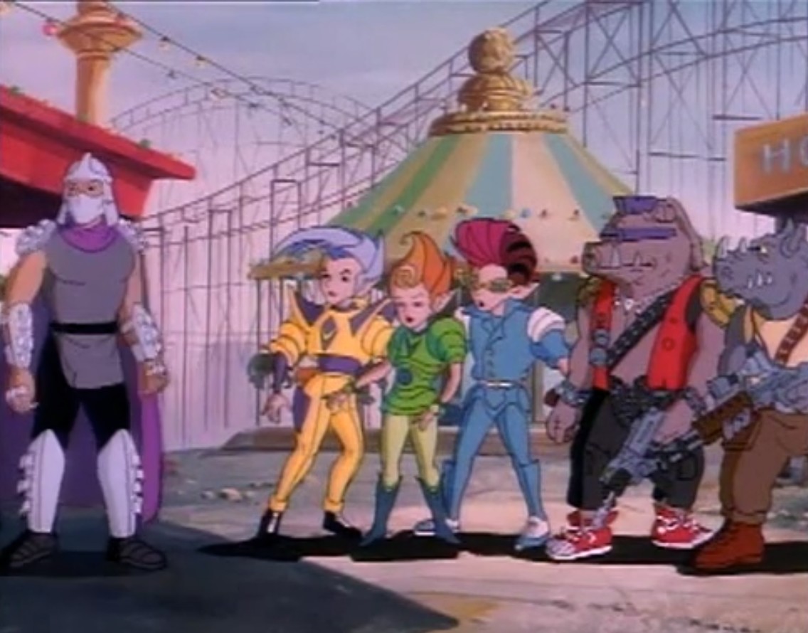 Les neutrinos étaient déposés dans un parc d’attractions. Shredder voulait savoir comment ils étaient parvenus à ouvrir un portail interdimensionnel. La langue bien pendue, les jeunes laissaient échapper que cela venait de leur véhicule. Bebop et Rocksteady étaient chargés de retrouver leur voiture volante, écrasée quelque part en ville.