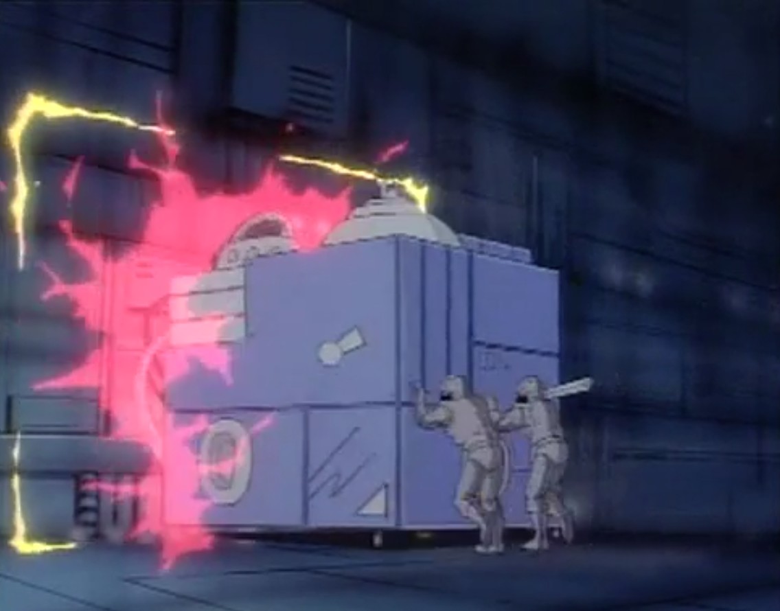 - Ce sont des soldats de Krang qui poussent le mental neutraliseur par le portail interdimensionnel jusqu’à la Terre. Mais ils sont très peu détaillés. On peut supposer qu’il s’agit de soldats de pierre, une fois encore colorés de gris.