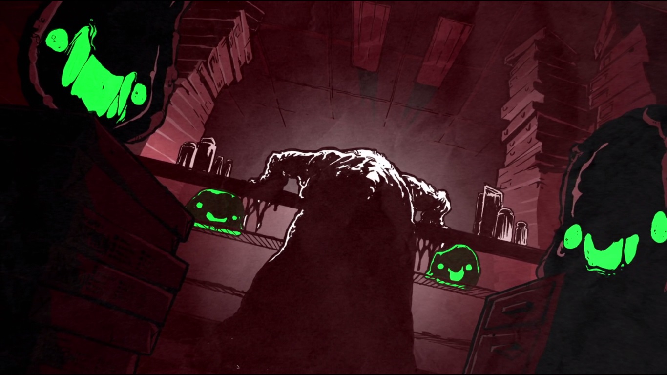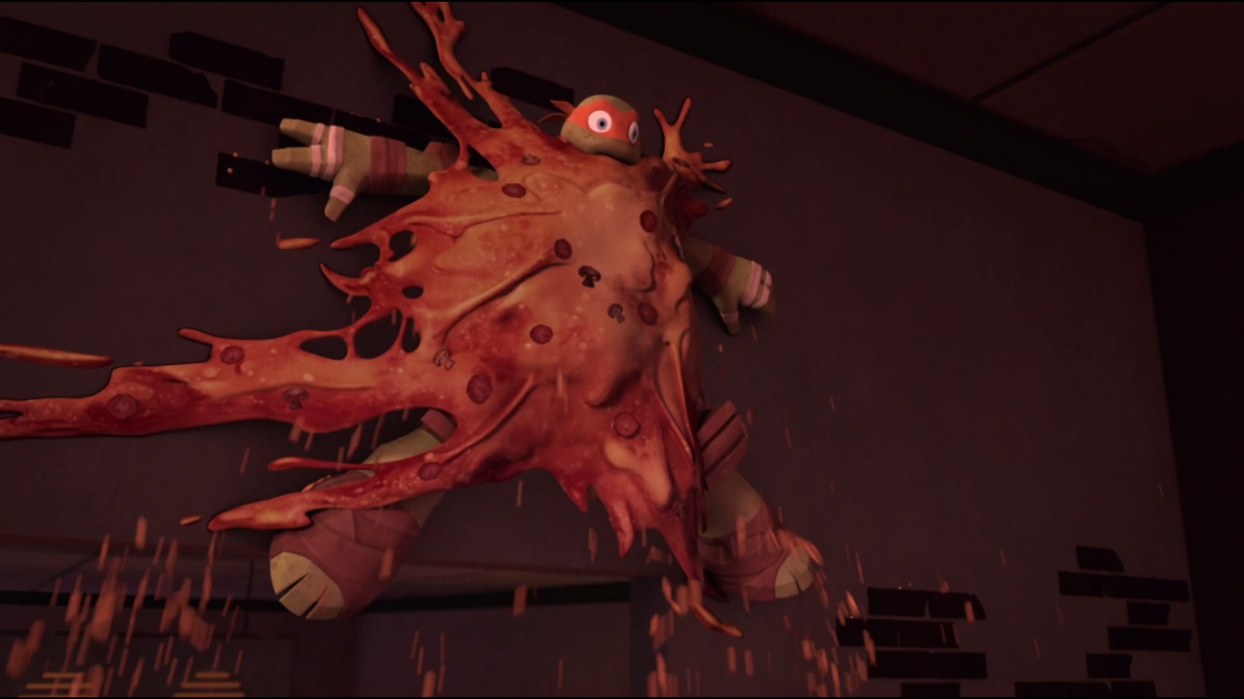 Une fois arrivé dans le repère, le ninja découvrait qu’ils avaient commandés des pizzas. Les trois tortues se trouvaient dans un état second, Splinter y compris ! Soudain, les pizzas s’en prenaient également à lui. Michelangelo n’avait d’autres choix que de les détruire. Se retournant, sa famille avait disparue…
