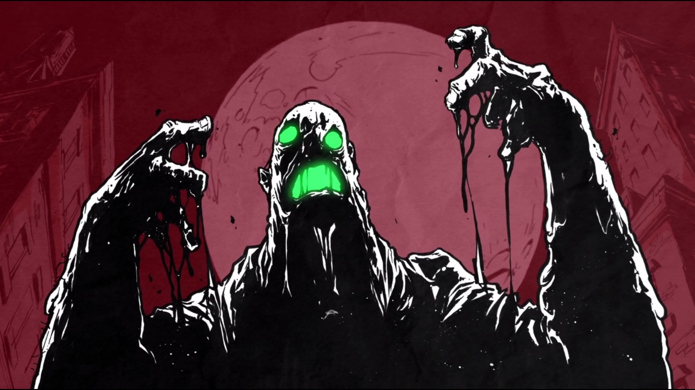 Les rues de la ville étaient vides. Toute la population se trouvait devant la pizzeria. Michelangelo se fondait dans le décor, se faisant passer pour un zombie. Entrant dans la pizzeria, il voyait April se faire fourrer dans une calzone géante.