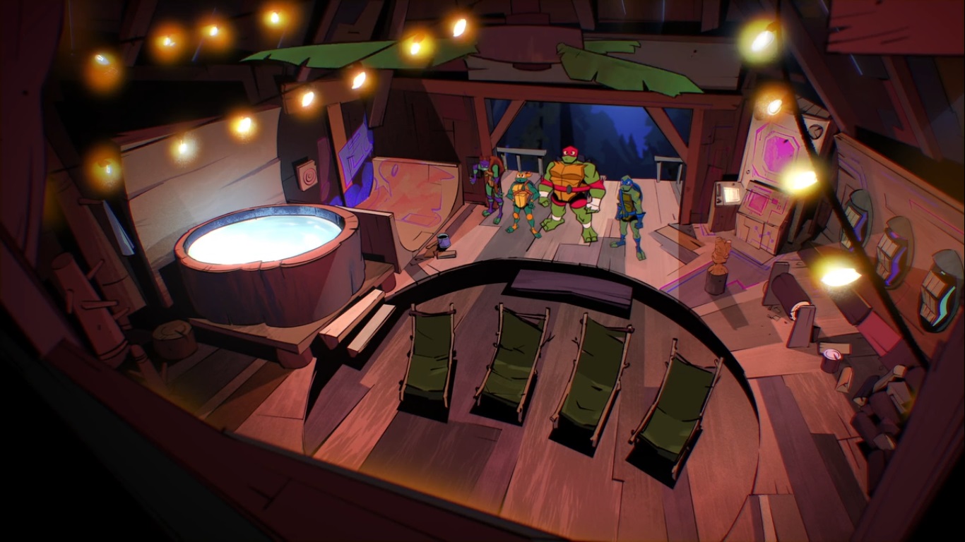 La nuit tombée, les tortues n’en pouvaient plus des leçons de Todd et Donatello les entraîna en dehors de leur camp, pour leur présenter sa dernière création : une cabane perchée dans un arbre qu’il venait de construire et qui était à la pointe de la technologie naturelle ! Entièrement en bois, eau chaude, animaux réduis en esclavage… Impossible pour les tortues d’en sortir, c’était un confort luxueux.