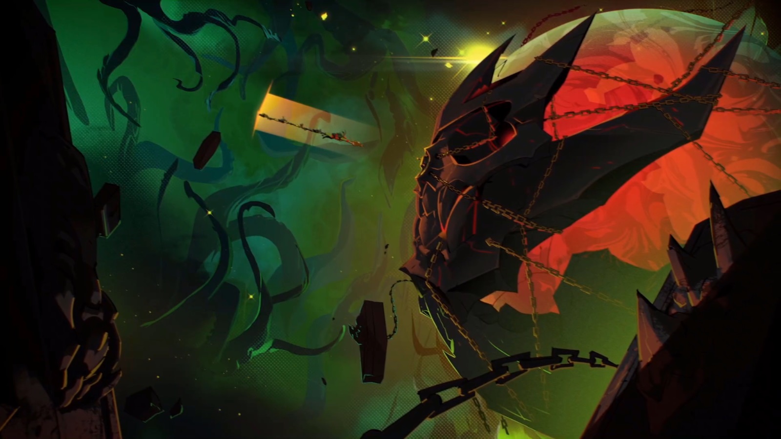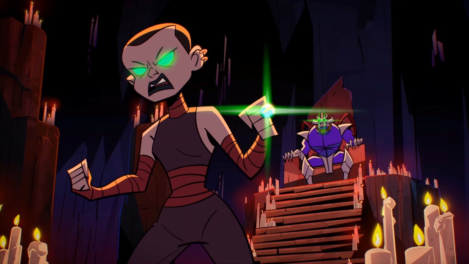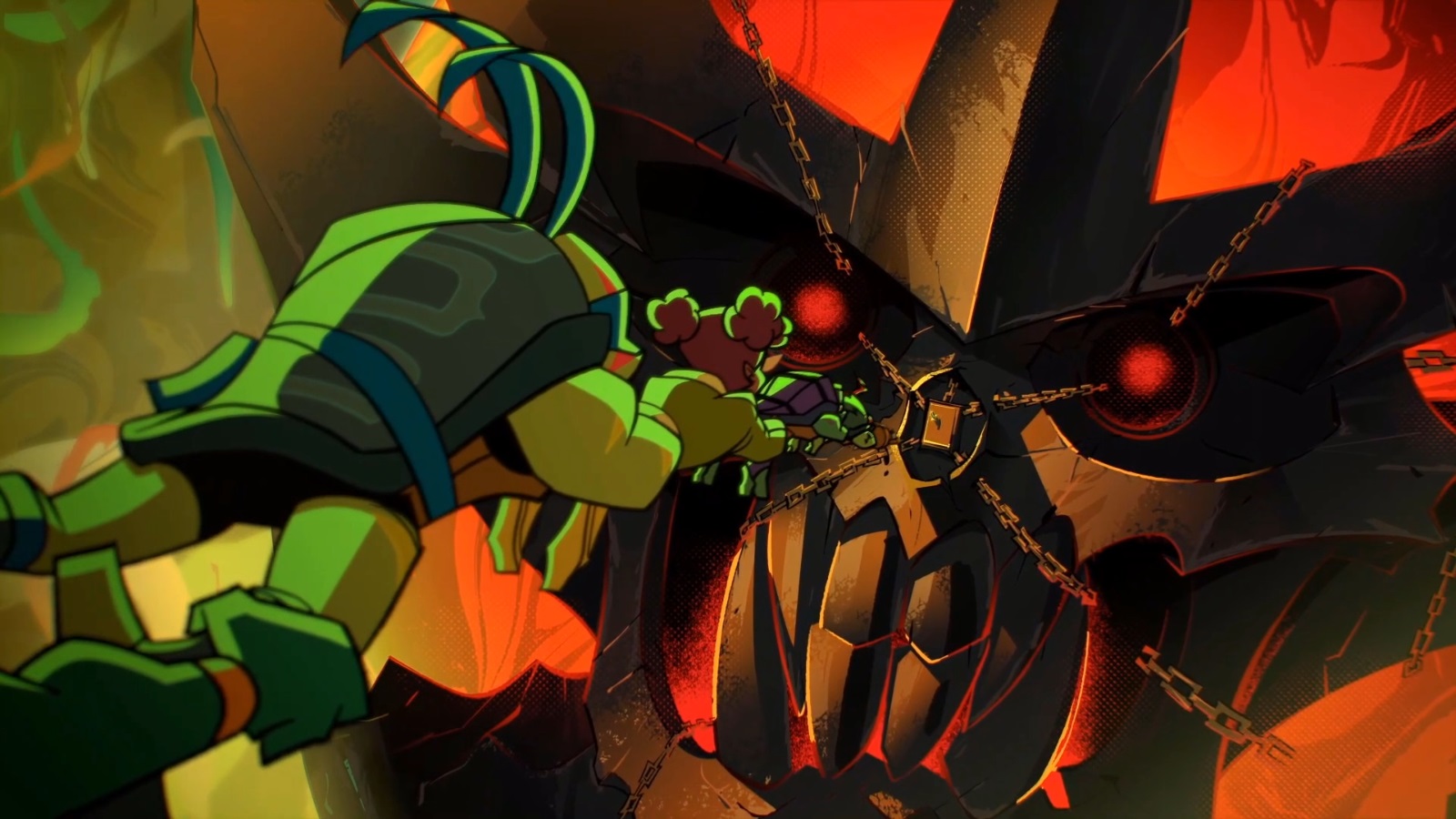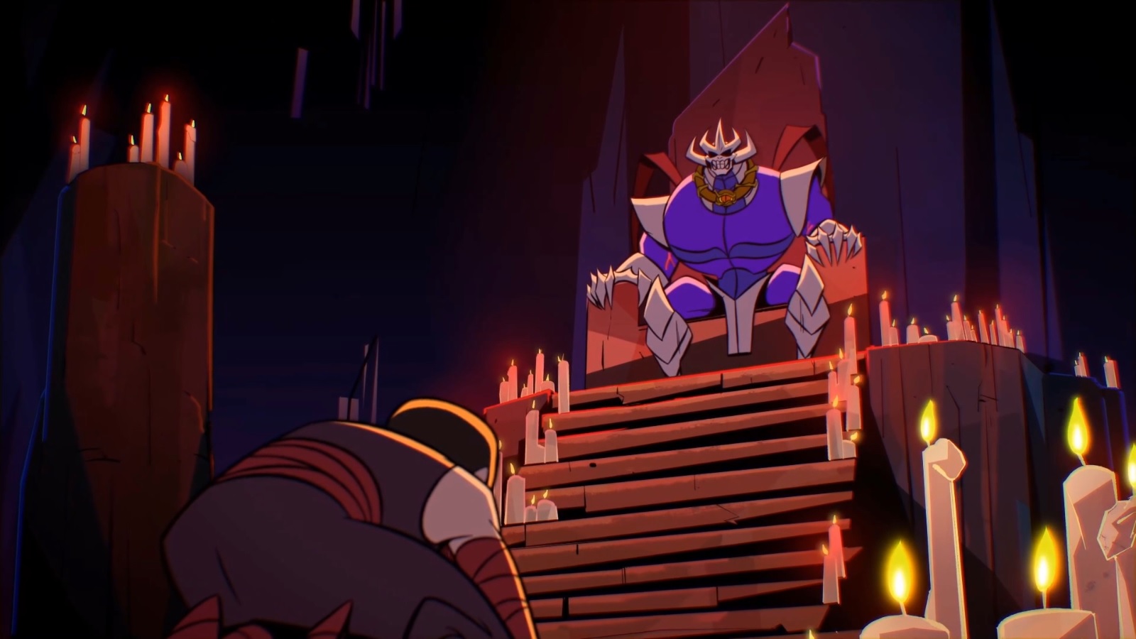 Dans le repaire du Foot Clan, une atmosphère morbide y régnait. Les bougies qui scintillaient alors d’une flamme jaune devinrent bleutées. Une énergie immense émanait de Shredder, qui venait de se libérer de son collier. Le démon était à présent entièrement de retour…