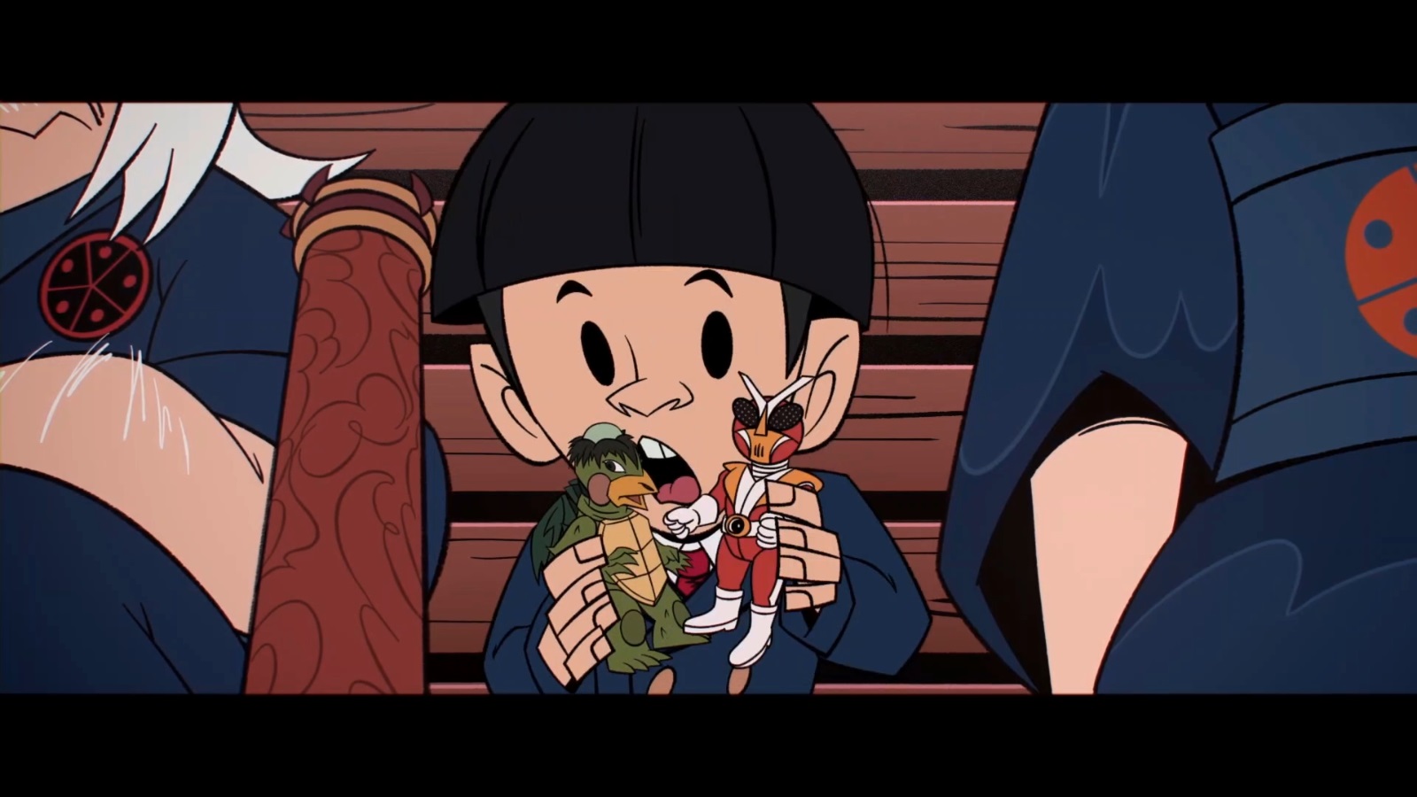 Les figurines avec lesquelles joue le petit Yoshi dans son troisième souvenir sont un kappa (tortue issue du folklore japonais) et une imitation entre Kamen Rider et Ultraman.