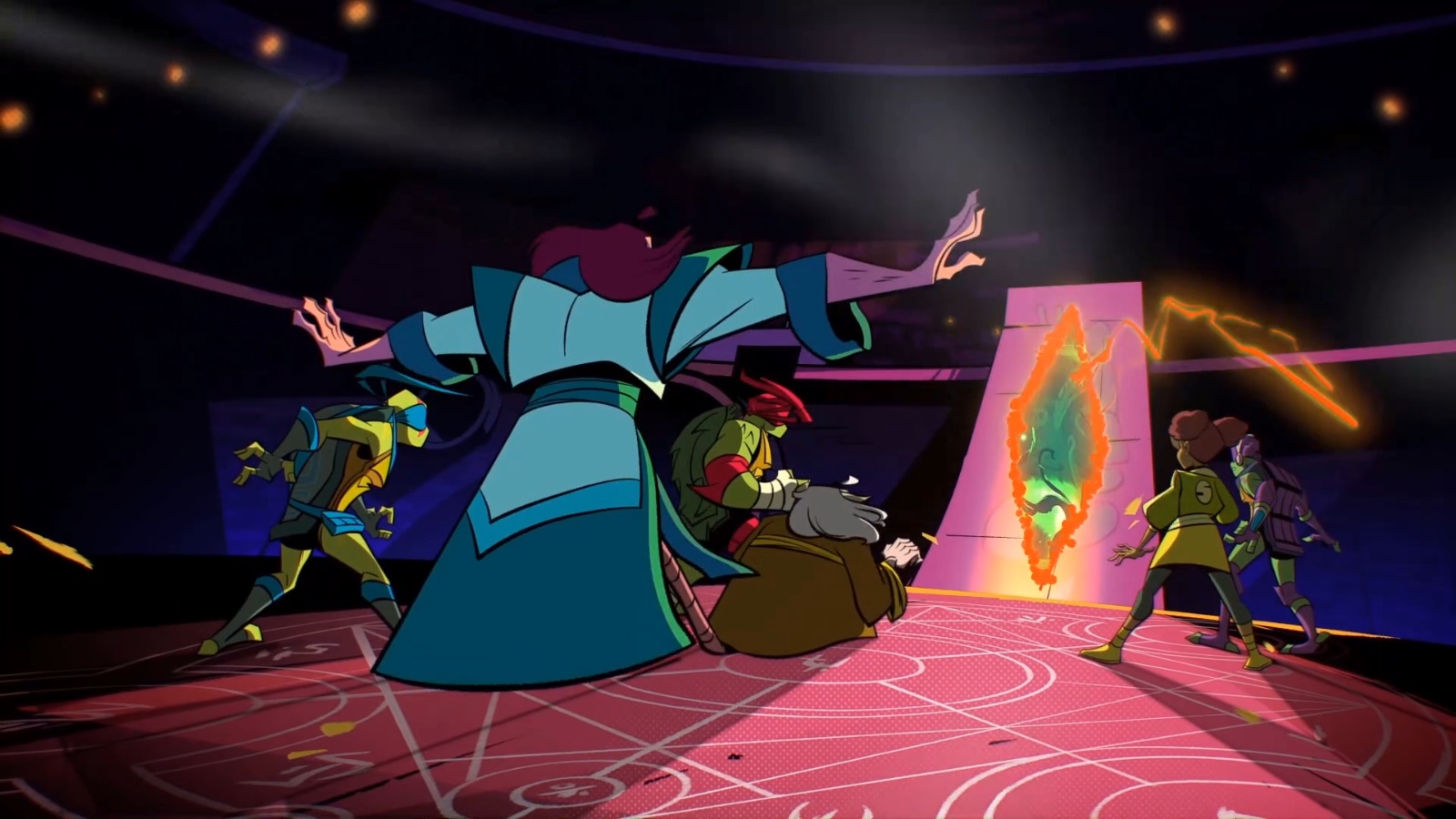 Un cercle magique avait été tracé au sol et le baron allait superviser l’opération. Splinter avait été placé au centre du cercle, ses fils autour de lui. Un sablier allait leur permettre de remonter le temps dans les souvenirs du rat. Cependant, les tortues allaient devoir rester prudentes. La mémoire de leur père risquerait d’essayer de les repousser. Posant ses mains sur le cercle, Draxum fit disparaître les quatre tortues dans le subconscient de Splinter.