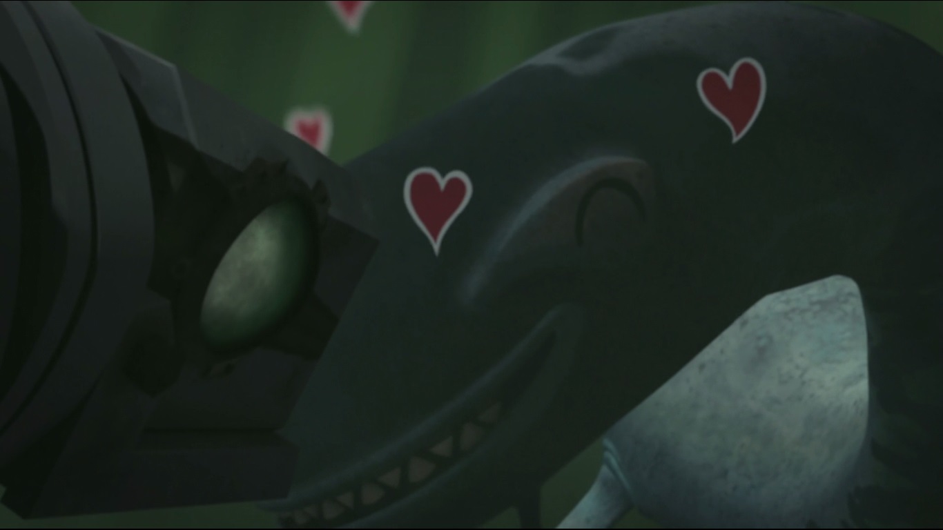 Sur le chemin pour le vaisseau kraang, les tortues retrouvaient une vieille connaissance. Le monstre de l’East River, qui était tombé amoureux du sous-marin de Donatello (La mission de Karai, S1 E21). Celui-ci tentait une nouvelle approche, mais déçu de voir que la carcasse de métal n’était toujours pas intéressée, commençait à l’attaquer. Les tortues ripostaient, parvenant tant bien que mal à s’en débarrasser. La langue du pauvre animal s’était coincée dans les propulseurs.