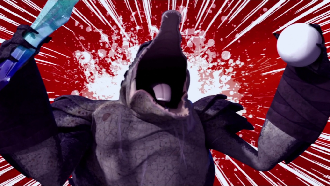 prisonnier dans une base de la Dimension X, cherchait désespérément d’échapper aux kraangs. Il était finalement parvenu à s’enfuir de la base et profitait d’un instant de répit pour contacter les tortues à travers un orbe de communication. Les kraangs ne tardaient pas à le retrouver et déferlaient sur l’alligator par vagues successives. Les premiers soldats étaient écrasés et broyés, mais le mutant ne pouvait pas résister longtemps à leurs assauts ininterrompus.