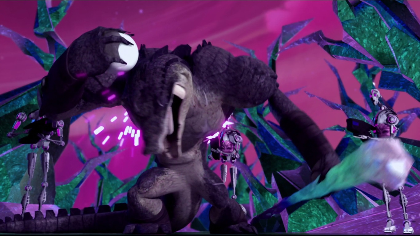 Explorant l’étrange dimension, les tortues apercevaient de nombreuses créatures, comme des sortes de sphères volantes avec la capacité de s’assembler les unes aux autres ou de se séparer. Cette étrange créature s’en prenait aux mutants, qui partaient se cacher dans une forêt de cristaux. Donatello en cueillait un, intrigué par sa structure. Il s’agissait des cristaux qu’utilisaient les kraangs comme pile à combustible ! Le cristal se mit à s’illuminer. Comprenant ce qui allait se produire, les tortues avaient à peine le temps de sauter que le premier cristal explosait, entraînant une destruction en chaîne des autres minéraux. Les reptiles étaient propulsés sur un astéroïde voisin. Leonardo faisait alors la rencontre d’une petite créature toute mignonne qu’il s’empressait de caresser. Il s’agissait d’une sorte d’appât de quelque chose de beaucoup plus gros, un Rocktopus.