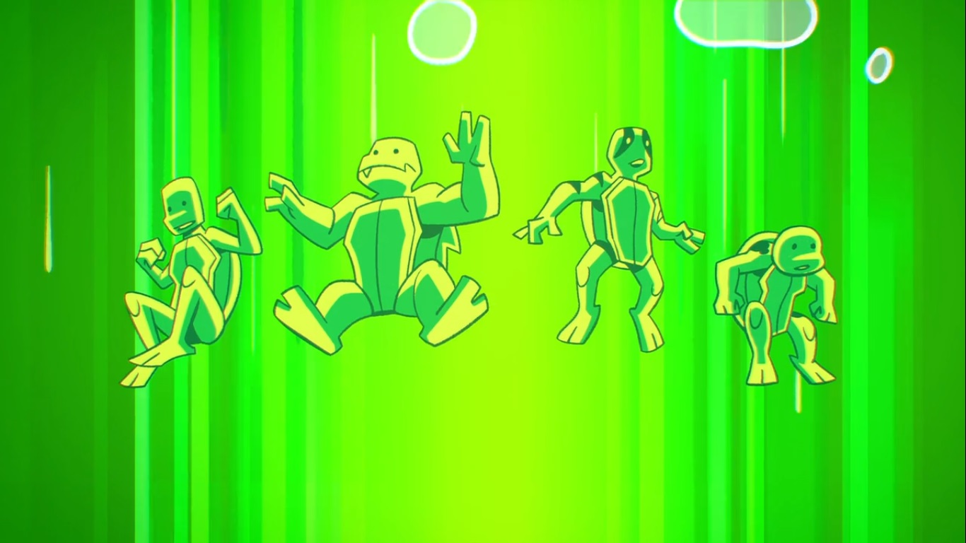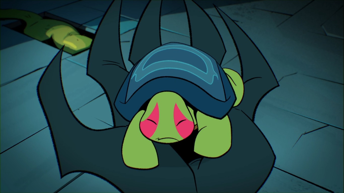 Draxum était très impressionné de voir que ses deux gargouilles avaient remplies leur mission. Elles pourraient à présent trôner sur ses épaules et dormir dans le panier du chien. Mission accomplie ! Lou Jitsu était enfermé dans une cage du laboratoire de l’alchimiste. Il ne tarda pas à voir les quatre tortues à côté de lui et leur donna des noms : Vert, Vert #2… C’est alors que Draxum s’approcha de lui. Jitsu n’avait réellement plus envie de se battre ou faire du mal à une quelconque créature. Il se fit alors mordre par Vert #2 (Raphael).