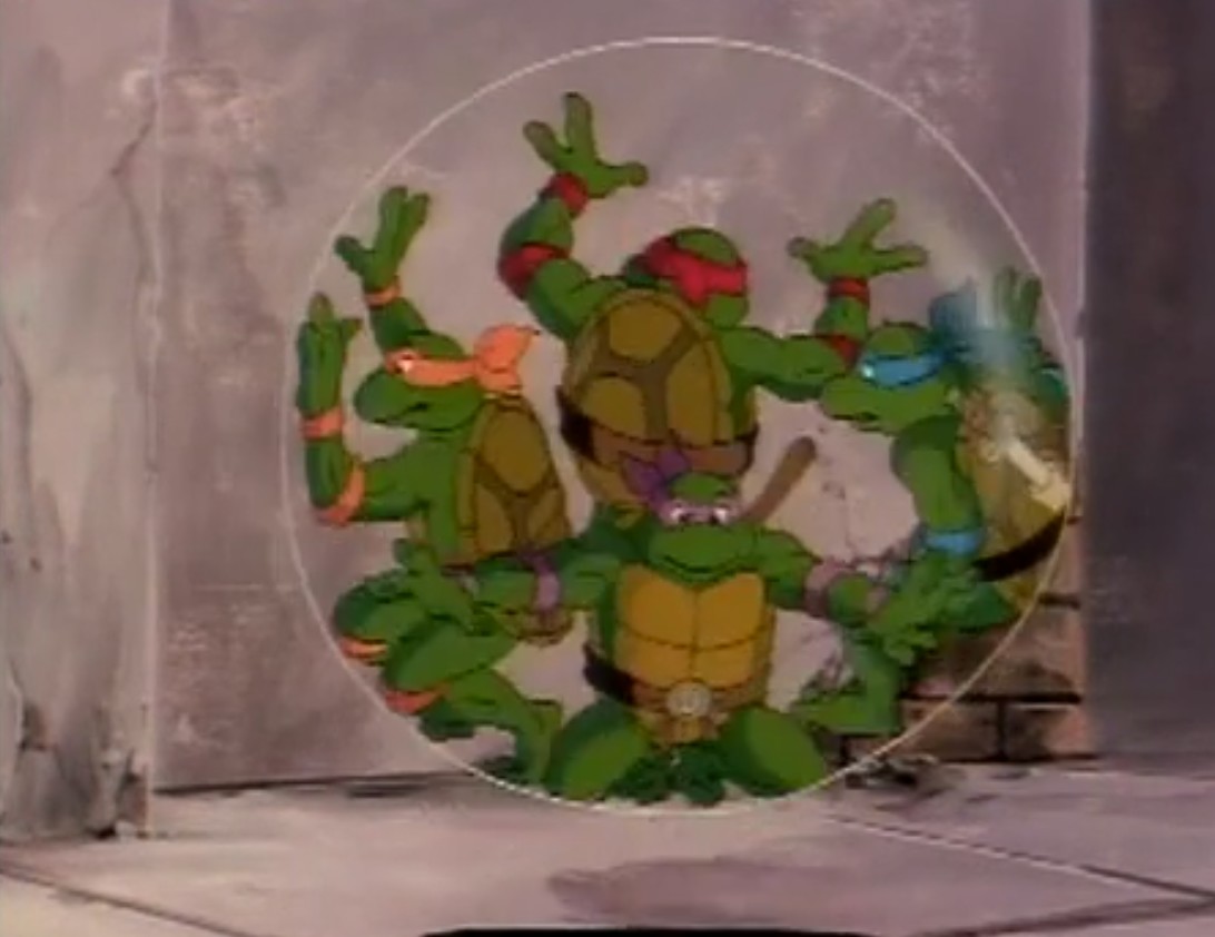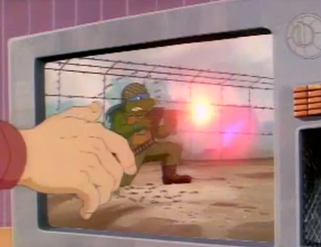 À la fin de l’épisode, Raphael change de chaînes à la télévision. Nous y voyons des parodies des Schtroumpfs, d’Alvin et les Chipmunks et une tortue ninja militaire sous le feu des tirs. Le costume ressemble beaucoup à celui de Lieutenant Leo sorti en 1991 chez Playmates Toys, soit deux ans plus tard. La figurine a commencé à être réfléchie seulement en 1990 d’après ses croquis.