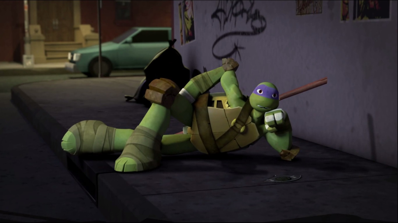 - Donatello s’écrie à la fin de l’épisode en version originale « I love being a turtle », la phrase fétiche des tortues prononcée dans les quatre films sortis jusqu’alors et dans Turtles forever.