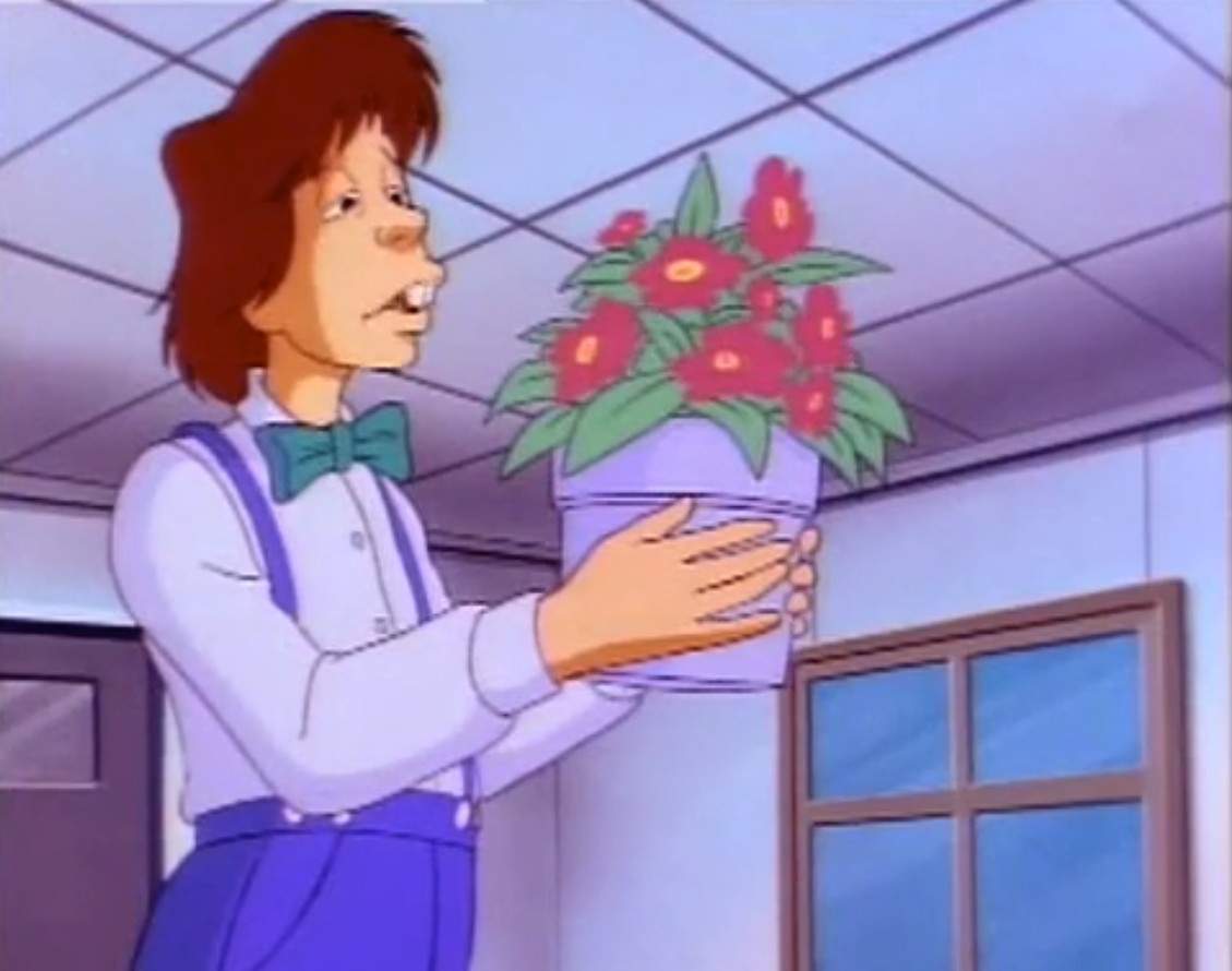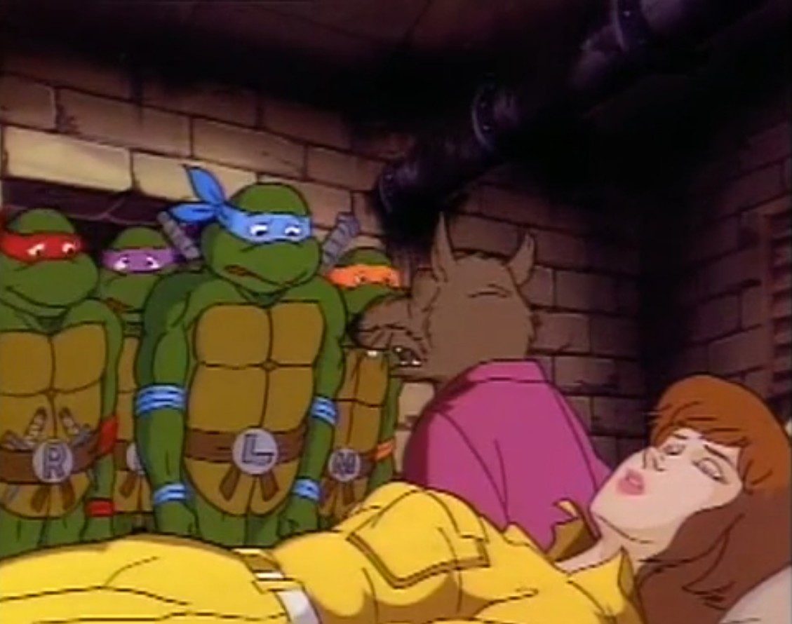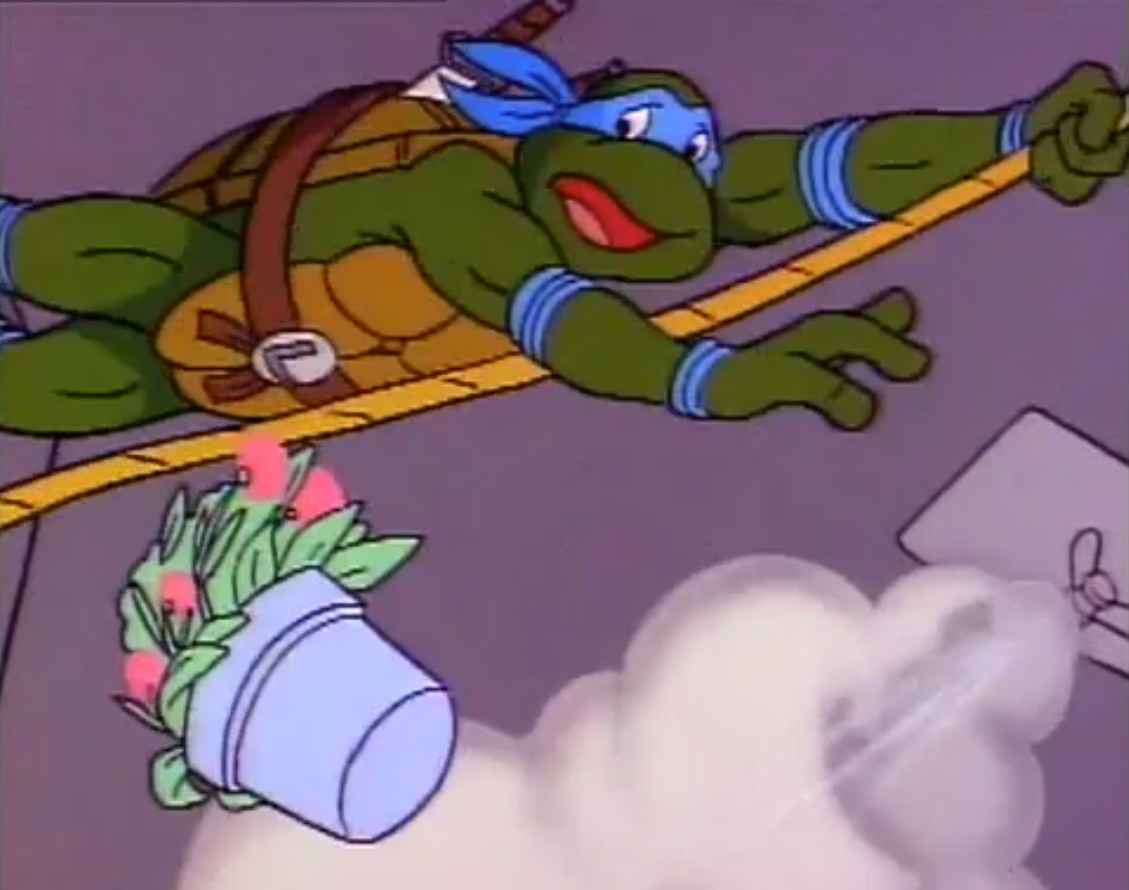 Une fois arrivée à la porte du repaire, la journaliste était reçue par Splinter, qui lui annonçait que les tortues s’étaient absentées. April était ennuyée du cadeau que les reptiles lui avaient fait. Mais à peine avait-il posé les yeux sur les fleurs que Splinter les saisissait pour jeter le pot à la poubelle. Il s’agissait d’une plante Doku (Doju planaVF). Il ne fallait surtout pas que quelqu’un sente la plante de près, ce qu’April avait déjà fait au bureau. Soudain, elle était prise d’un malaise et tombait dans les pommes.