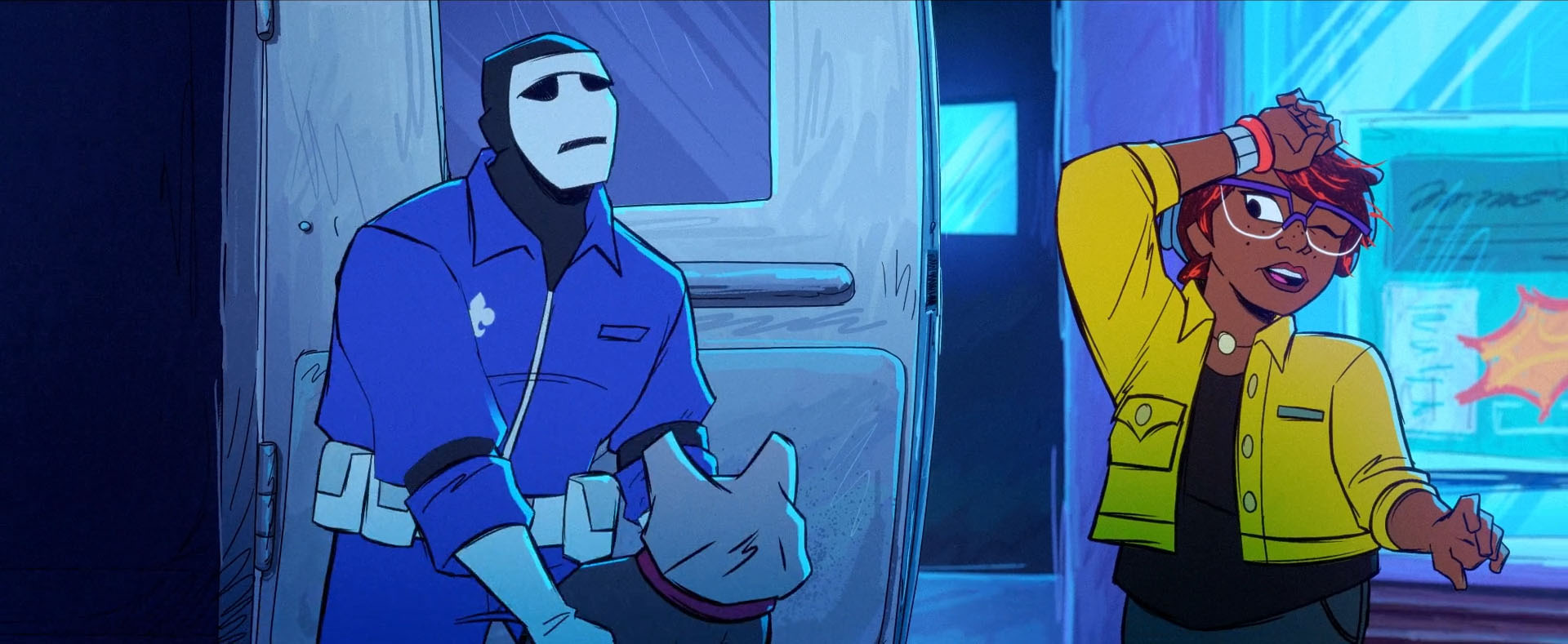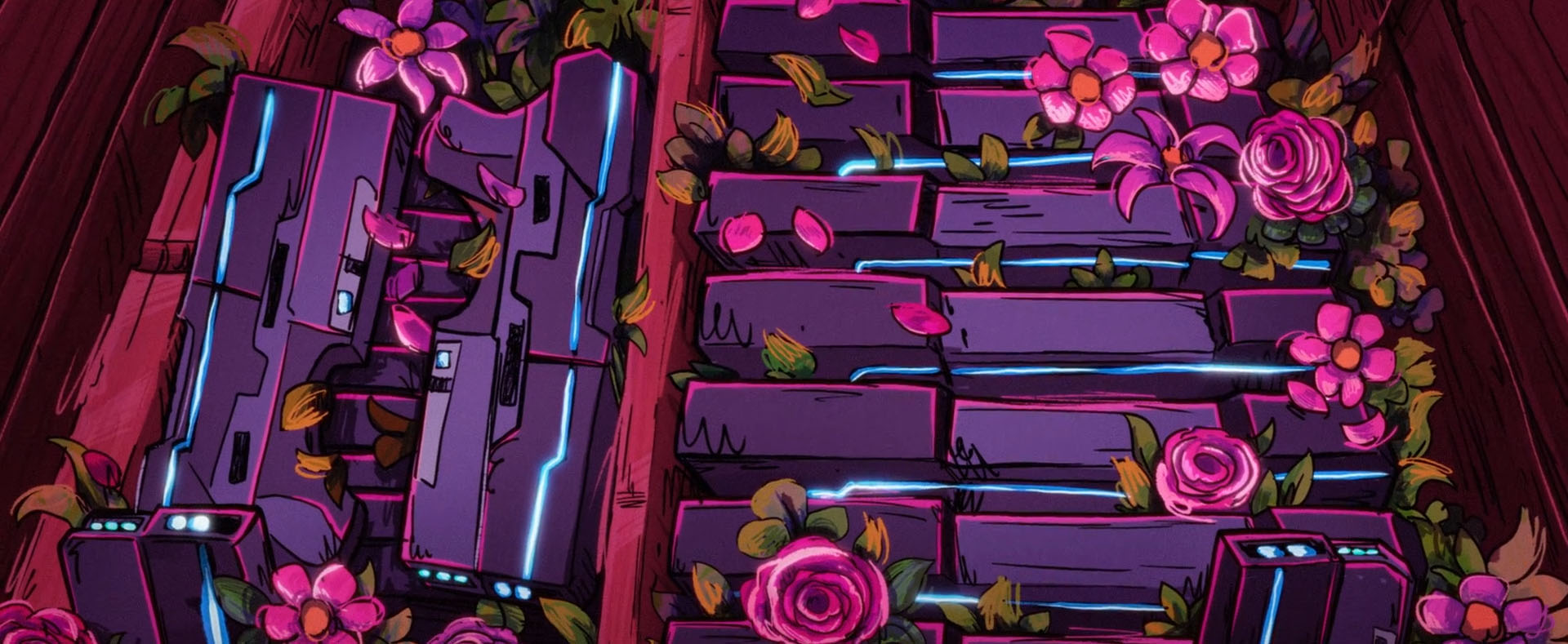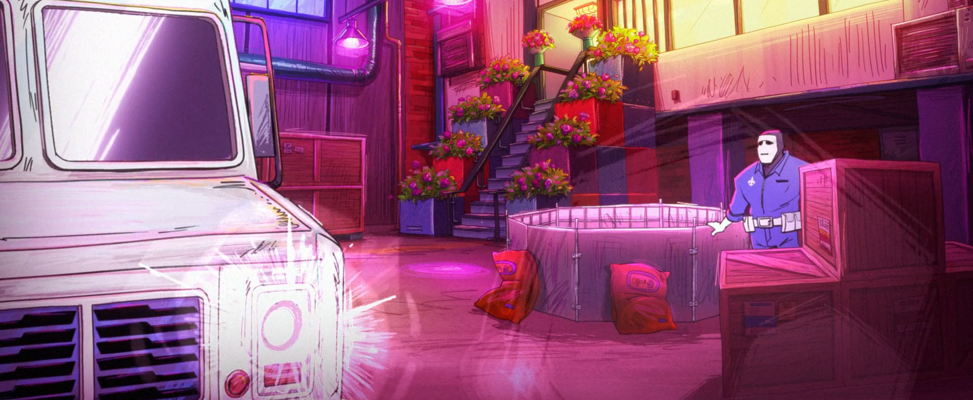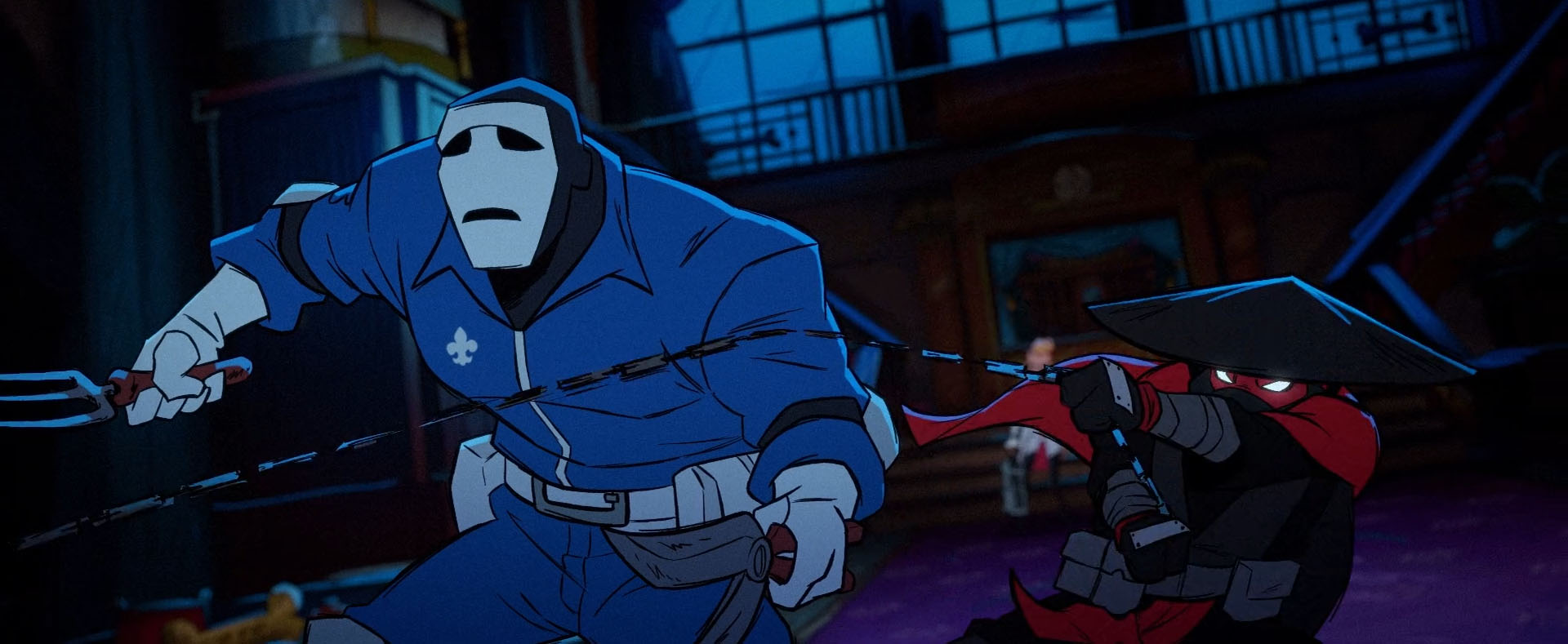 Soudain, une fourgonnette s’arrêtait au niveau d’April et dérobait le chien. Leonardo, posté au sommet d’un immeuble, filait à ses trousses, suivi de près par ses frères. Le véhicule s’arrêtait devant un garage et entrait discrètement à l’intérieur. Les voleurs portaient tous une combinaison bleue et un masque de théâtre blanc. Les mutants arrivaient par les toits tandis qu’April les suivait avec son scooter. Une fois à l’intérieur de l’entrepôt d’une compagnie de fleuriste, les tortues découvraient des armes cachées dans des bouquets. Ils étaient peut-être sur quelque chose de beaucoup plus gros que prévu… Les tortues étaient paniquées, la situation les dépassait.