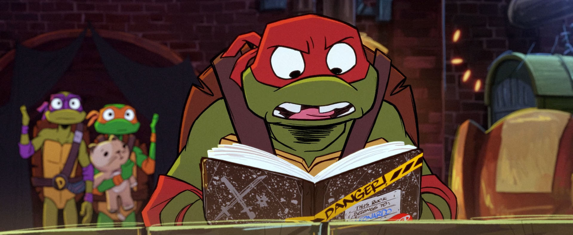 Voilà déjà un moment que Leonardo se prenait pour un super-héros tel Batman. S’il s’en cachait plus ou moins maladroitement de ses frères, il ne s’était pas privé de consigner ses aventures dans un journal intime. Et Raphael l’avait trouvé malencontreusement. Alors qu’il lisait avec une voix rauque les aventures de son frère, Donatello et Michelangelo entraient et lui faisaient la morale. Ils ne lui avaient pas dit pour autant de s’arrêter de lire !
