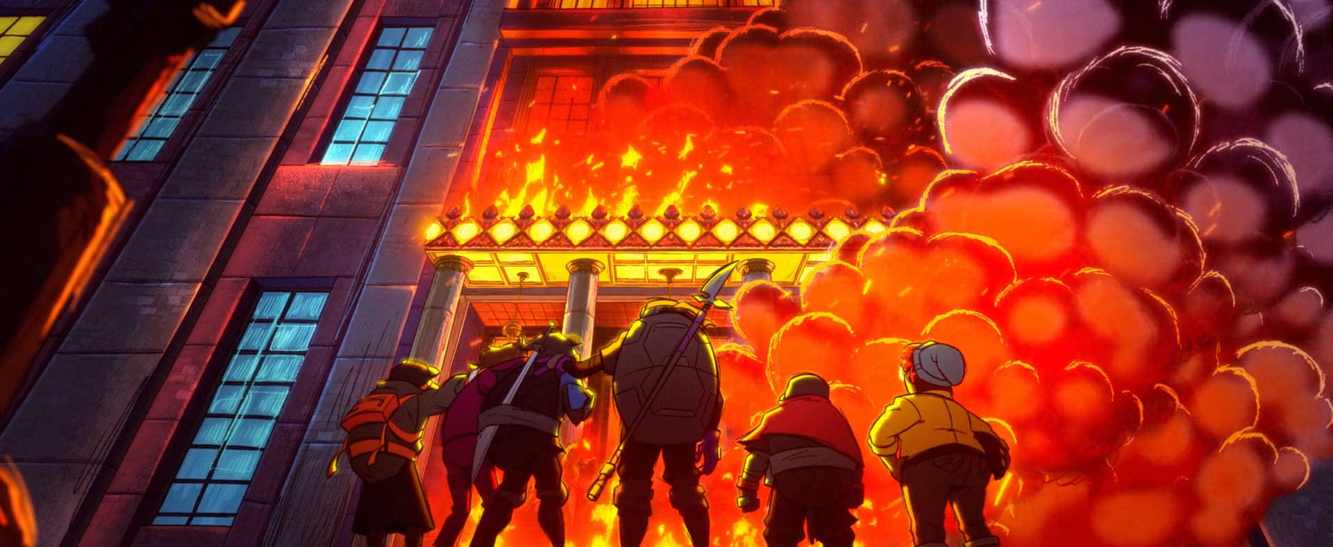 Le bâtiment explosait sous les yeux des trois autres tortues, déjà à l’extérieur. Heureusement, Leonardo était parvenu à sortir le blessé. Ils avaient un très puissant et mystérieux ennemi à arrêter. Le Ninja de la nuit se demandait s’ils avaient pris les bonnes décisions. Au moins tous les chiens avaient été sauvés. Les autres tortues étaient épatées par ce qu’avait fait leur frère. Même Donatello était de nouveau enthousiaste ! Face au désastre, Leonardo préférait jeter sa cagoule et tout arrêter. Les évènements le dépassaient.