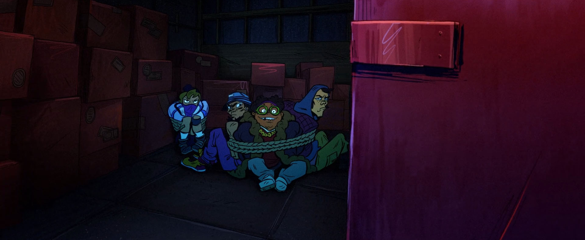 Soudain, un kunai se fichait dans le lampadaire et brisait l’ampoule. Le lieu était plongé dans l’obscurité. D’autres poignards plaquaient la manche de la veste de l’un des bandits contre la camionnette qu’ils chargeaient. La voleuse reculait et se faisait agripper par un grappin qui l’attentait à côté de containers. Elle disparaissait dans un grand cri. Les deux derniers malfrats, esseulés et aveuglés par l’obscurité, entendaient une voix effrayante venue d’un autre container. Le Ninja de la nuit leur sautait dessus et les ligotait. Après cela, le héros libérait un gardien. Ce dernier s’empressait d’appeler la police pour arrêter définitivement les voleurs. S’éloignant du lieu du combat, le ninja retirait son masque. Il s’agissait de Leonardo !
