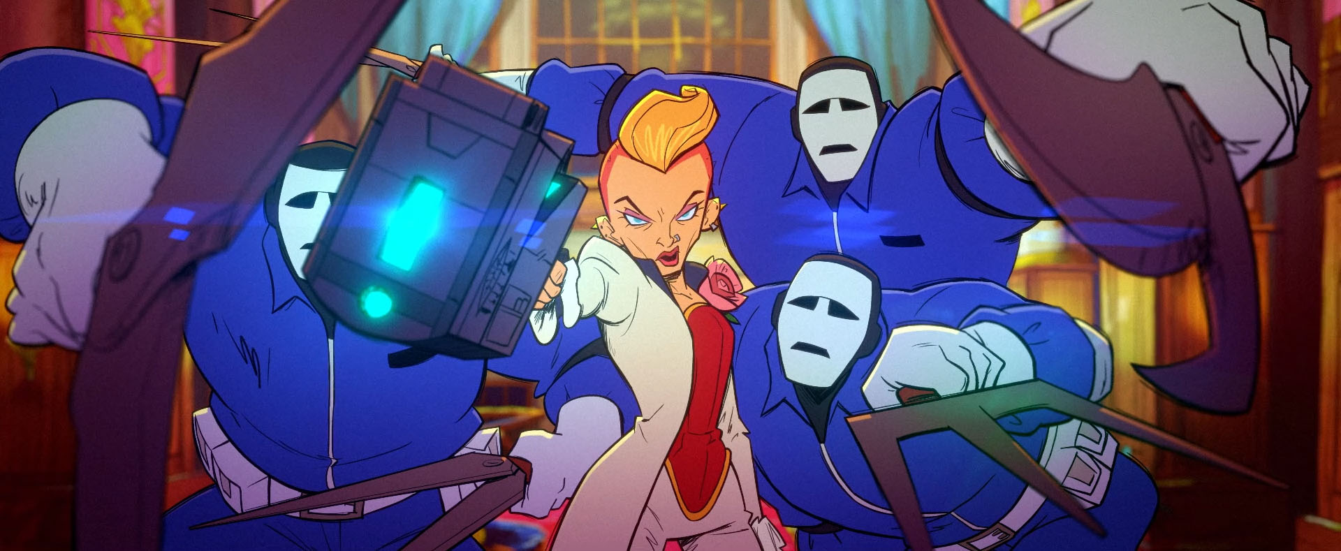 April avertissait ses amis que d’autres hommes arrivaient. Les ninjas se cachaient dans l’obscurité de la pièce lorsqu’une femme entrait à son tour, très bien habillée mais avec un poing américain. Elle frappait l’un de ses larbins qui avait coupé une rose de trop en la regardant avant de rejoindre le reste du groupe. Tout était prêt pour l’assaut final. Ils pourraient enfin être libérés d’un cercle vicieux qui les empêchait de faire leurs affaires. La femme, La Fleur, ordonnait à ses hommes d’attaquer La Papatte Dorée, un hôtel de luxe pour chiens. April accourrait pour prévenir les tortues et tombait sur un des malfrats. Raphael le poussait dans le décor avant d’entendre la suite de l’opération. Tout cela devenait bien trop gros pour de simples adolescents, Donatello était d’avis qu’ils appellent la police. Le temps pressait, ils devaient intervenir.