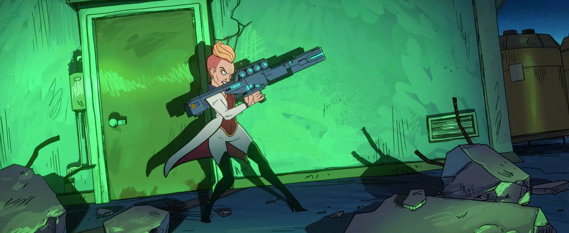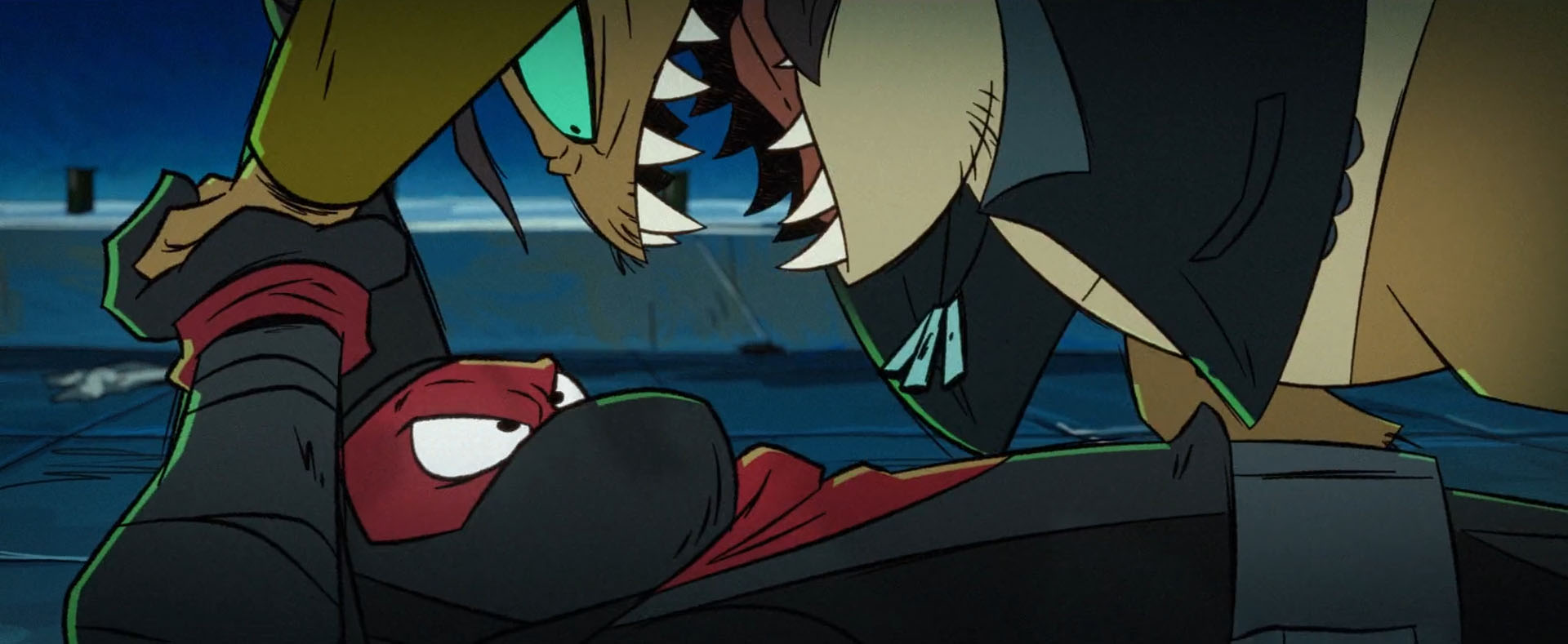 Leonardo bondissait hors de la fumée pour retrouver la compagne de son père. Il était repoussé par une puce. Les trois autres créatures se précipitaient sur les autres frères pour leur sucer le sang. Dans la bataille, Donatello se rendait compte que le pourtour de l’immeuble était truffé de bombes à gaz pour les chiens. Sans plus tarder, Leonardo filait sur l’antenne pour sauver Scumbug, mais se faisait arrêter par Scratch. Celui-ci lui assénait des coups de griffes.