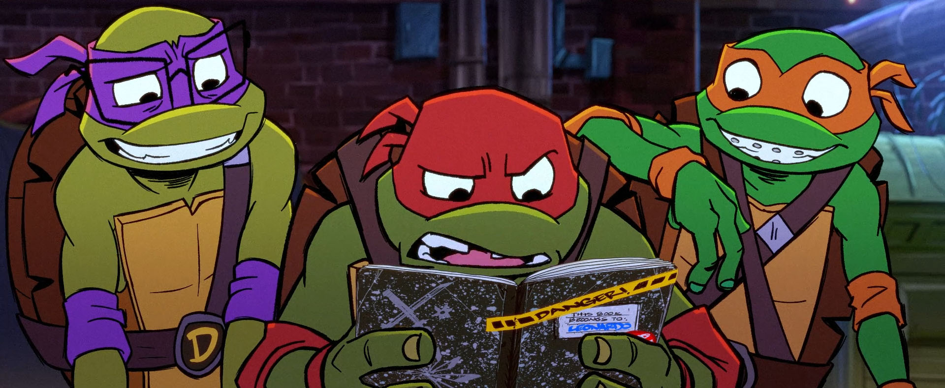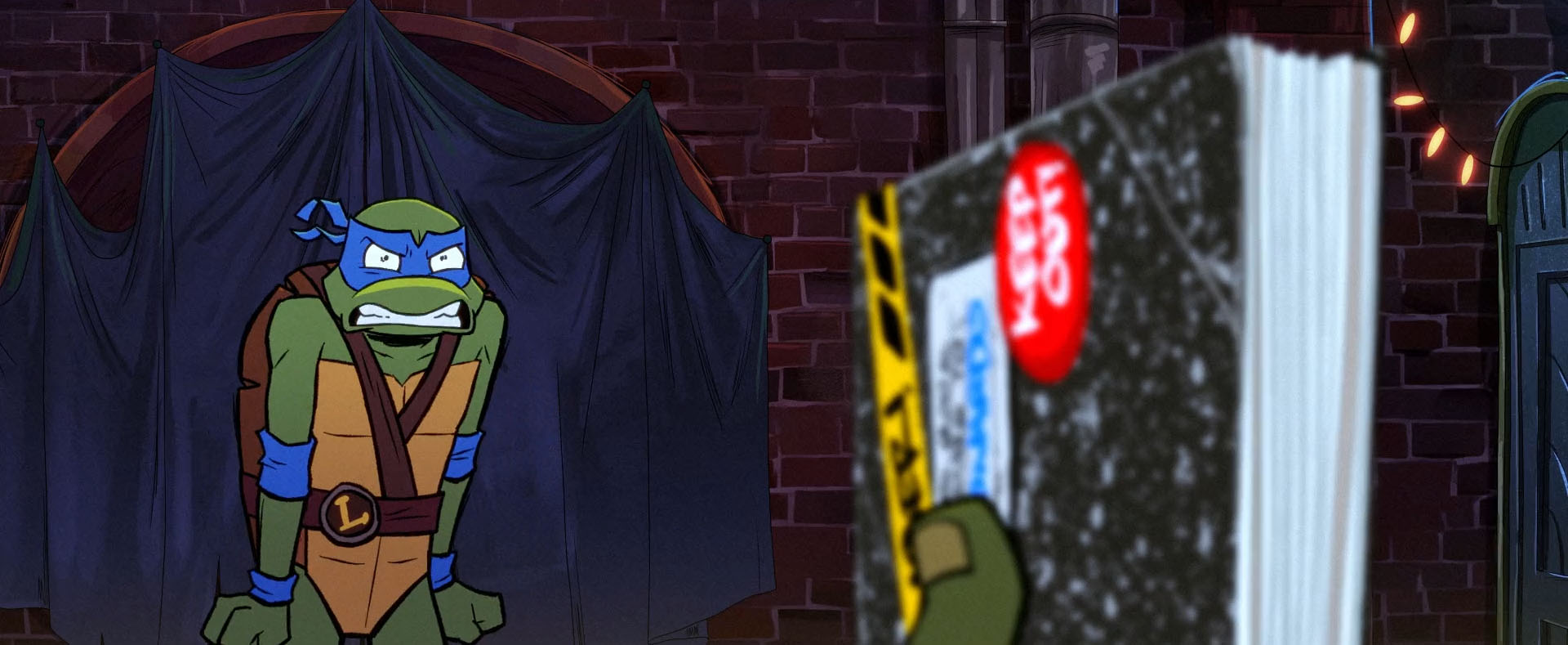 L’histoire du Ninja de la nuit prenait fin. Leonardo entrait dans sa chambre et surprenait ses frères en train de lire son journal et était furieux…