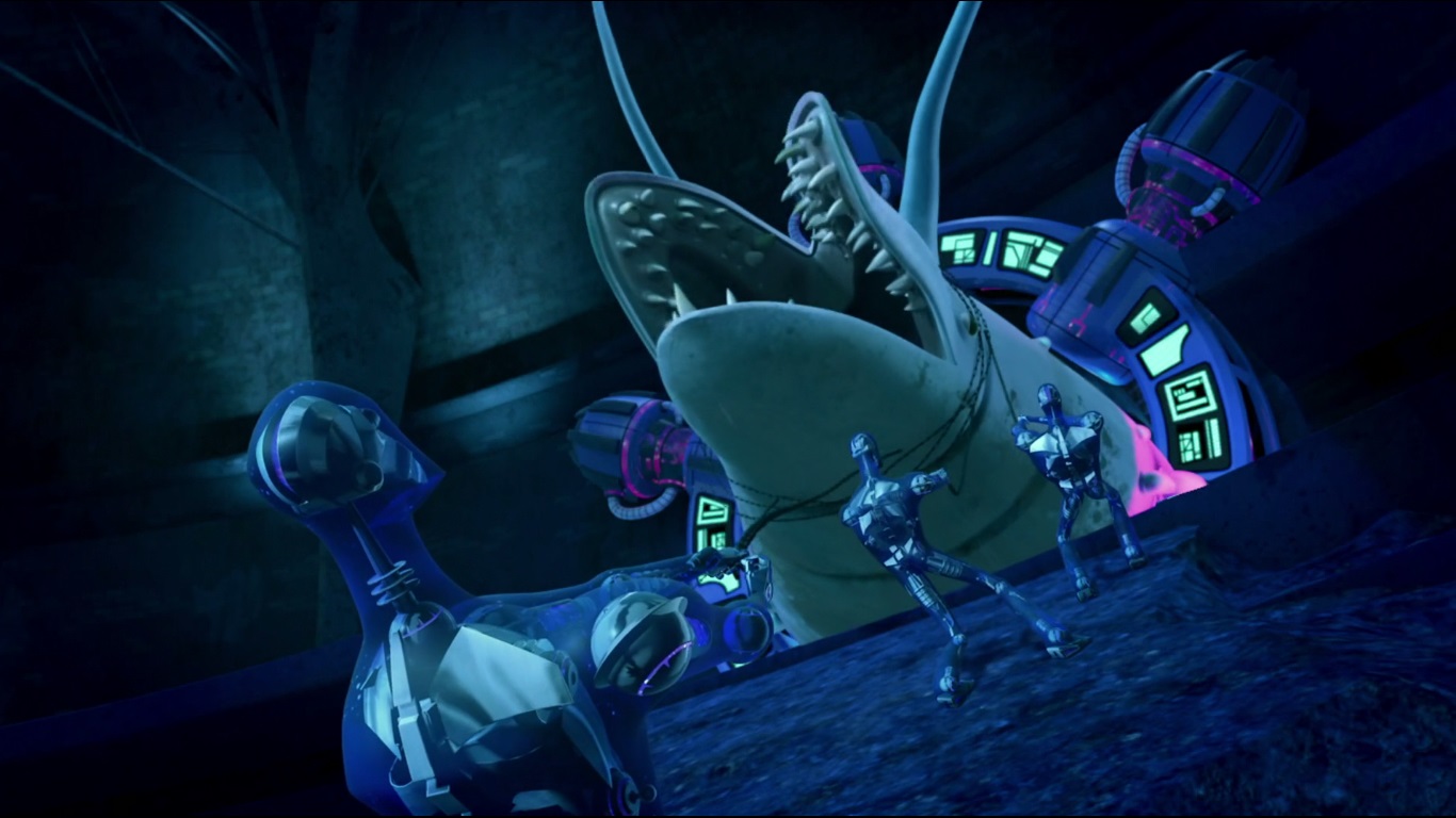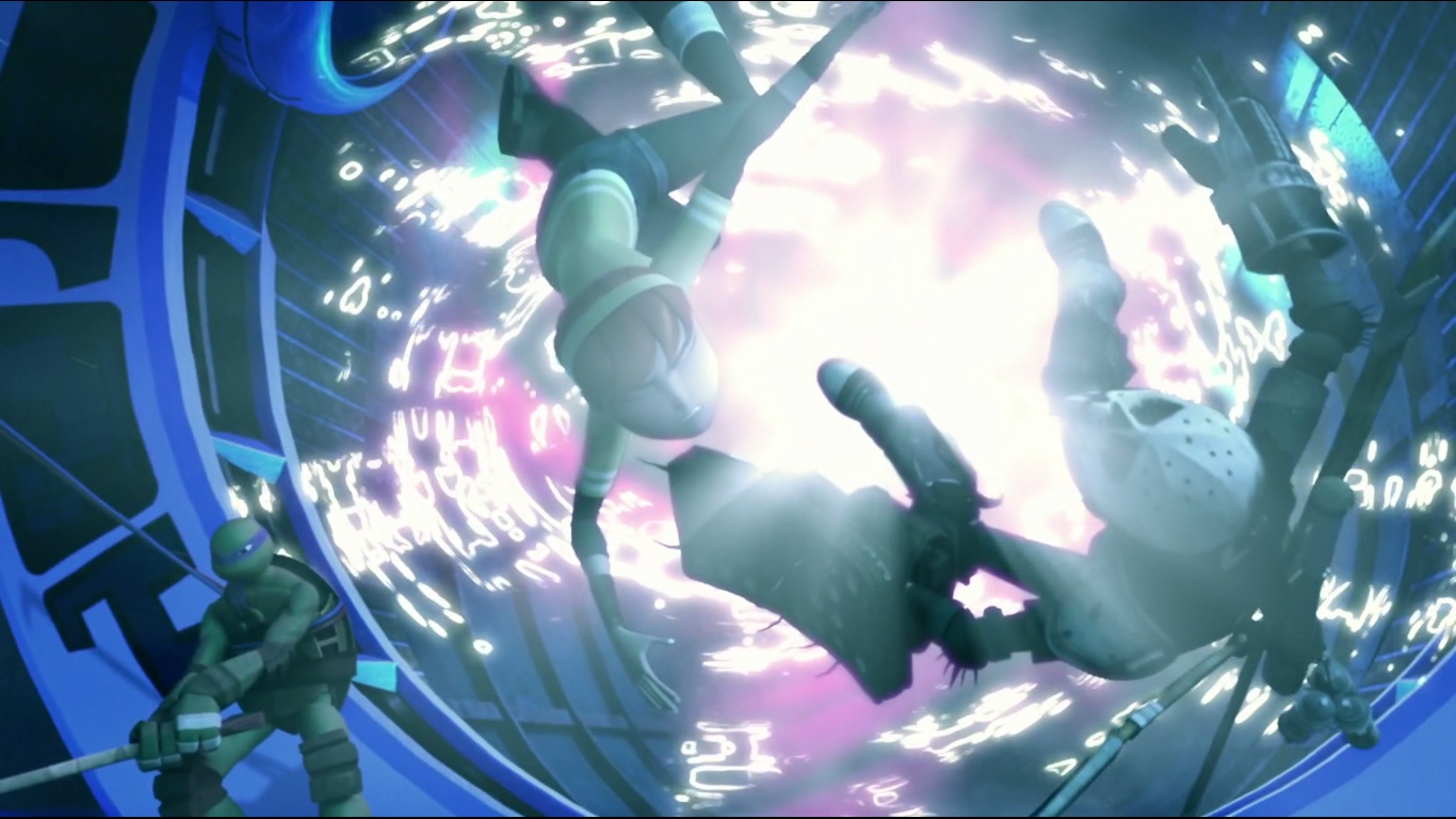 Mais les kraangs n’étaient pas loin. À travers un portail, deux biotroids s’attaquaient aux intrus. Tant bien que mal, l’un des deux robots se faisait détruire. Le second renvoyait Leonardo, Raphael et Michelangelo sur Terre, à travers un autre portail.