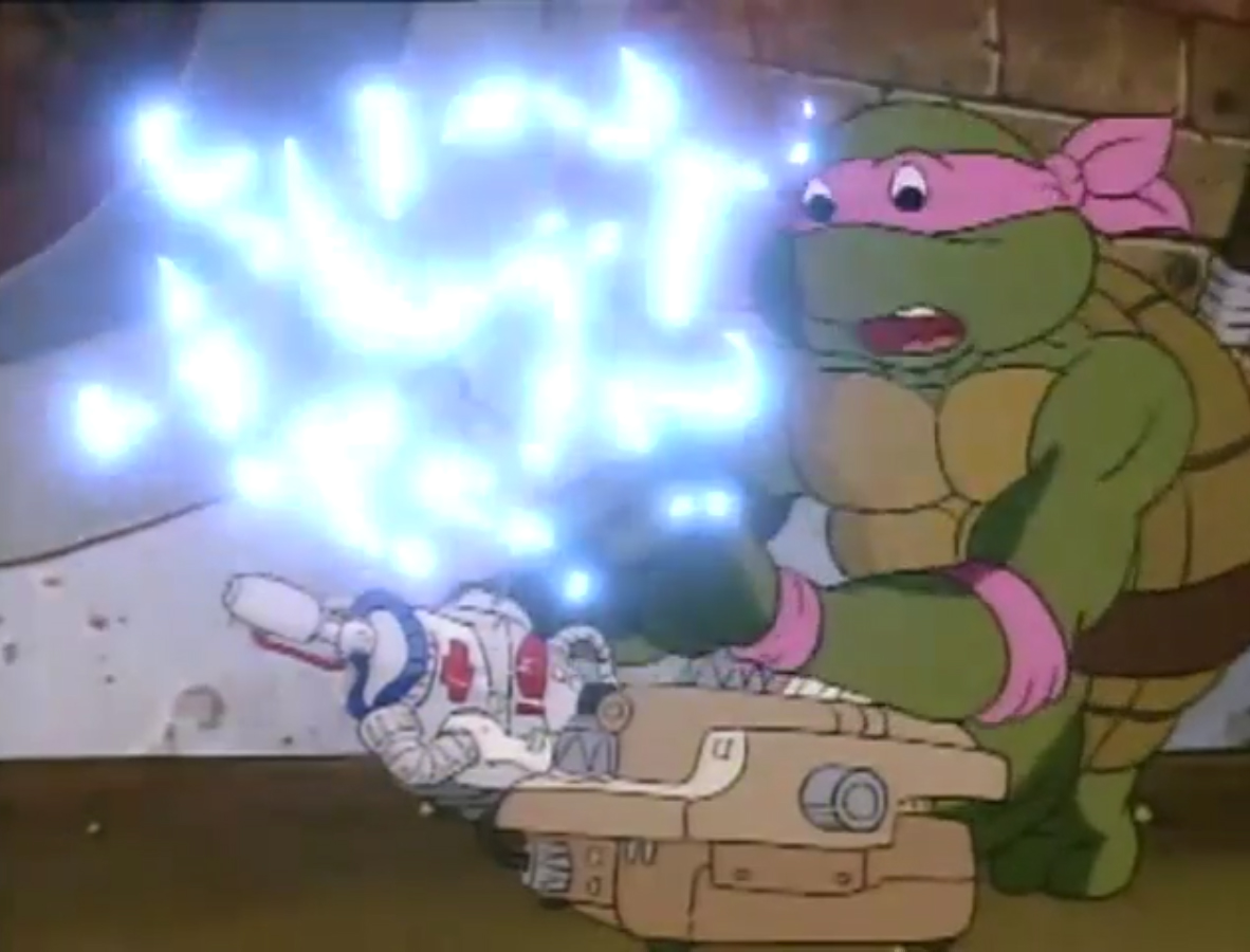 De retour au Technodrome, Shredder confiait sa prise à Krang, qui se mettait à tirer à tout va. Il manquait un petit module contrôlant la direction du rayon laser dans la poignée de l’arme. Hors de question de s’en servir en l’absence de cet objet. Ils devaient repartir à la surface trouver le module, qui s’était certainement détaché lors du combat contre Splinter.