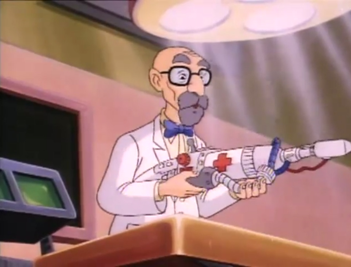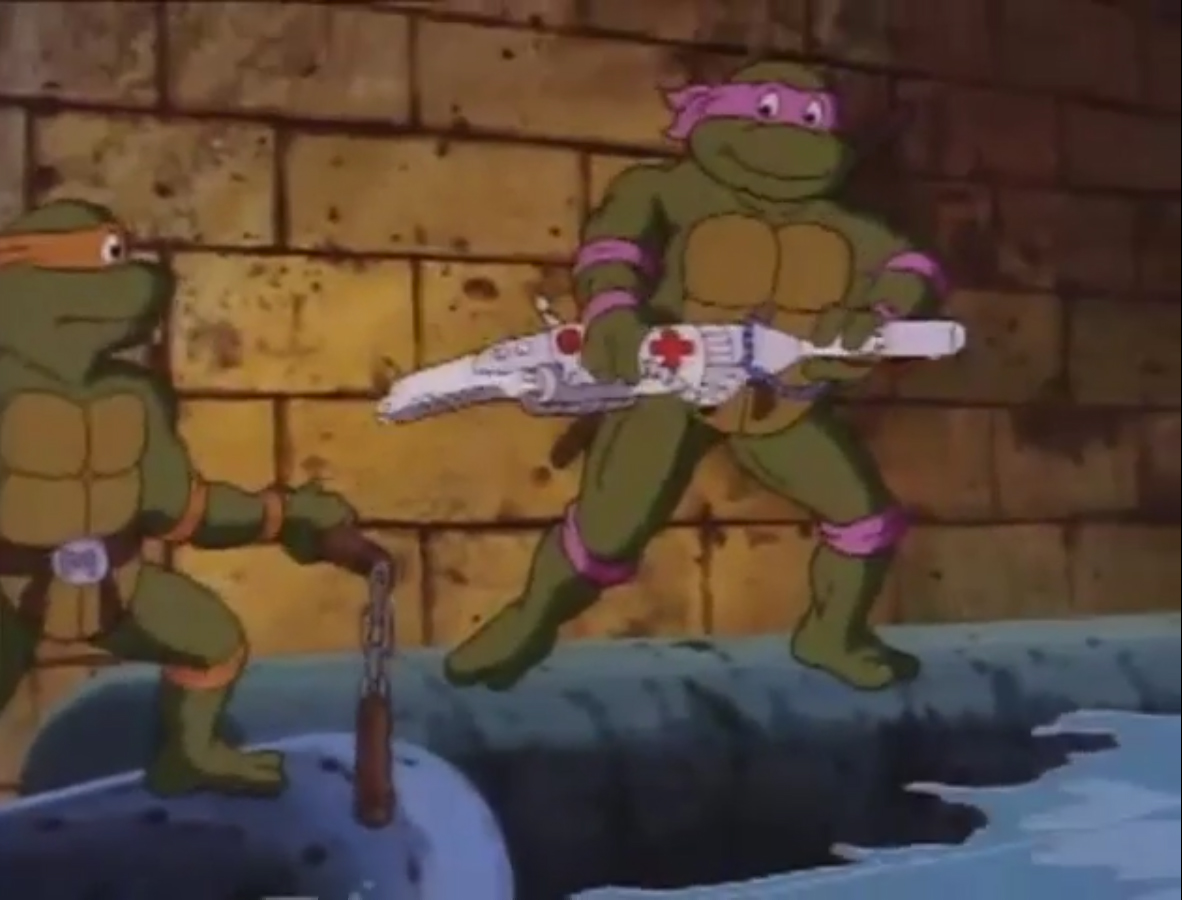 Ramené au repaire, la journaliste prenait soin du rongeur. Les tortues entraient au même moment et regrettaient d’avoir pris du bon temps. Donatello pensait qu’en inversant la polarité du fusil, ils pourraient soigner leur maître. Leonardo refusait qu’ils perdent du temps à se lamenter. Ils partaient à la recherche du rayon.