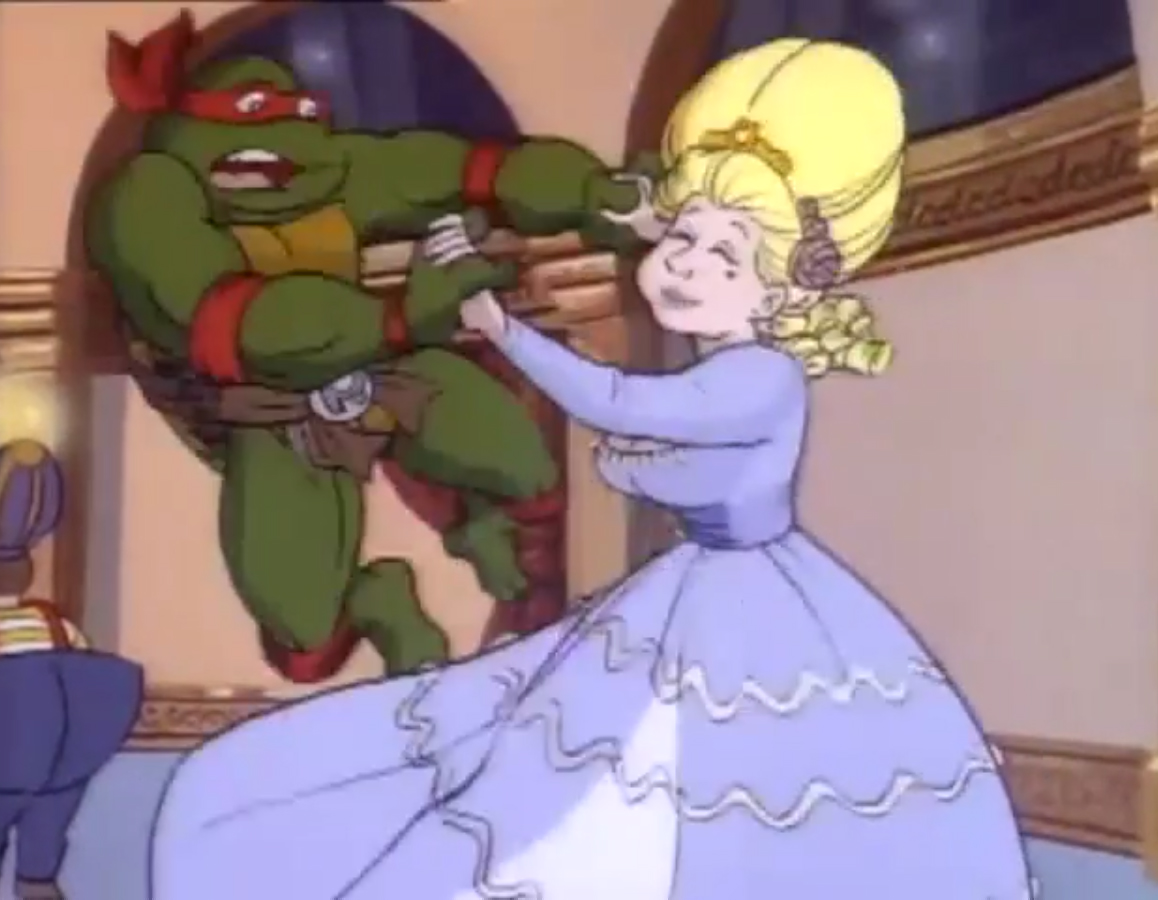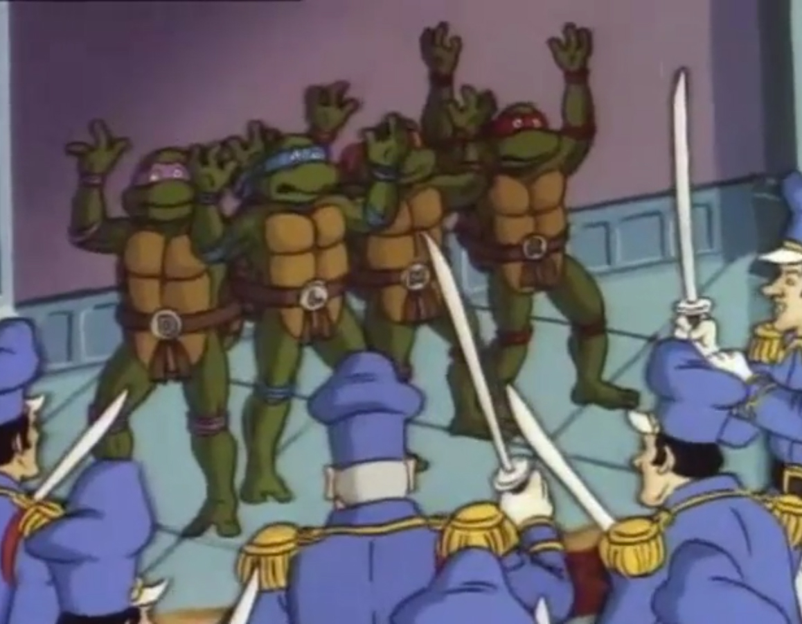 En pleine session d’essayage de robe, April recevait un appel des tortues qui voulaient s’assurer qu’elle n’avait pas d’ennuis. Donatello lui apprenait que Shredder et ses mutants se trouvaient justement à la réception organisée par l’ambassade de Malacuria. Au même moment, les trois individus entraient dans la chambre de la princesse et s’emparaient d’April, la prenant justement pour la fille de l’empereur. Sans perdre de temps, les tortues escaladaient la façade du bâtiment pour atteindre les toits. Une odeur de pizza guidait les mutants vers le salon de réception. Elles entraient par une baie vitrée. Leur apparence ne devrait pas être un problème autour de toutes ces personnes déguisées.
