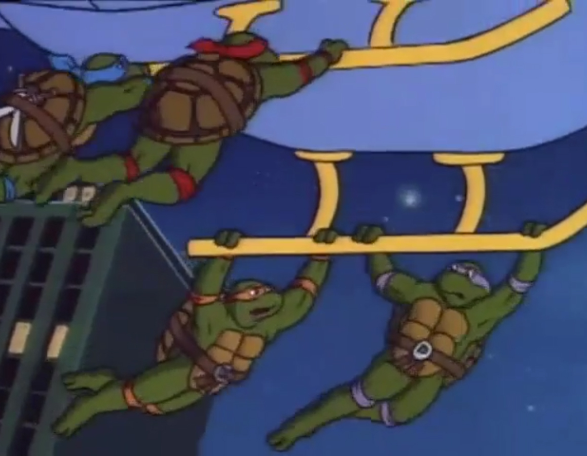 April se faisait très vite rattraper par Shredder et ses mutants. Ils avaient leur ticket de sortie. Arrivés sur le toit, ils voyaient l’empereur, les suppliant de relâcher la princesse. Les trois malfrats embarquaient dans l’hélicoptère, avec la journaliste. Les tortues atteignaient le toit au même moment et sautaient sur les patins d’atterrissage. L’appareil prenait de la hauteur et se montrait très instable. Les intrus risquaient de tomber à tout moment. Heureusement non loin de là, Donatello avait déposé le turtle blimp. Les tortues n’avaient plus qu’à sauter sur sa structure et l’utiliser pour retrouver Shredder. Ce dernier s’était posé sur le toit du musée des arts et avait demandé à Krang qu’il fasse venir un module.