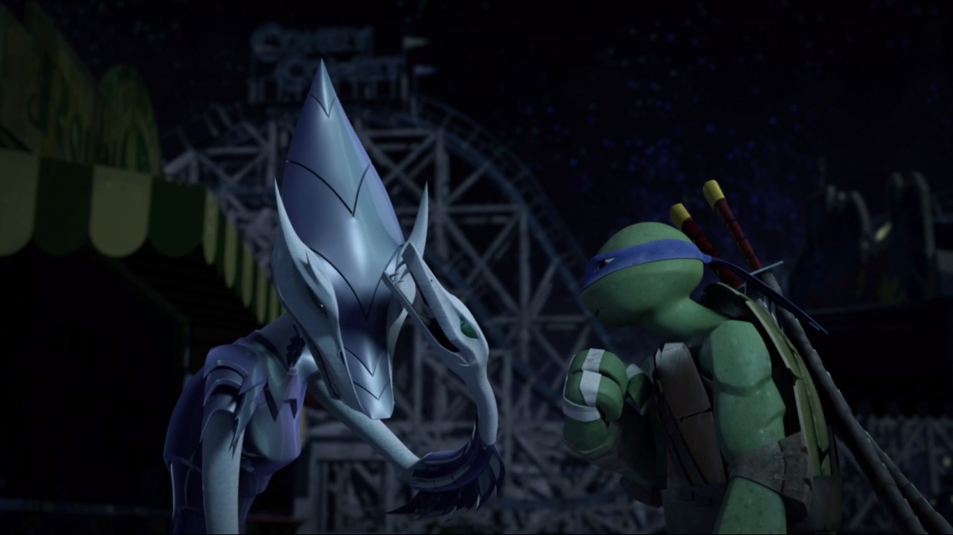 Dans la pizzeria abandonnée, les tortues étaient à la recherche du lieu que Karai avait indiqué à Leonardo. Il s’agissait certainement de sa cachette. Mais le simple mot « Comète », la piste que le serpent lui avait donné à la tortue avant de s’en aller (La chasse au serpent, S3 E10) n’était pas une mince affaire. Donatello avait trouvé trois références potentielles dans la ville, une laverie, un film qui est à l’affiche d’un cinéma, et le Coney Comet Roller Coaster du parc d’attraction de Coney Island. Michelangelo implorait Leonardo de le laisser partir vers ce troisième lieu. La tortue organisait des groupes : April et Donatello partaient pour le Comet Cleaner, Raphael et Casey pour le cinéma, et son petit frère et lui se rendraient au parc d’attractions. Pour cette nouvelle opération, Donatello avait eu le temps de concocter à peine trois flacons de rétro-mutagène. Les tortues devraient donc faire attention et l’utiliser avec beaucoup de modérations. La mutation de Karai était très spéciale, le scientifique n’était même pas certain que son produit fonctionne.