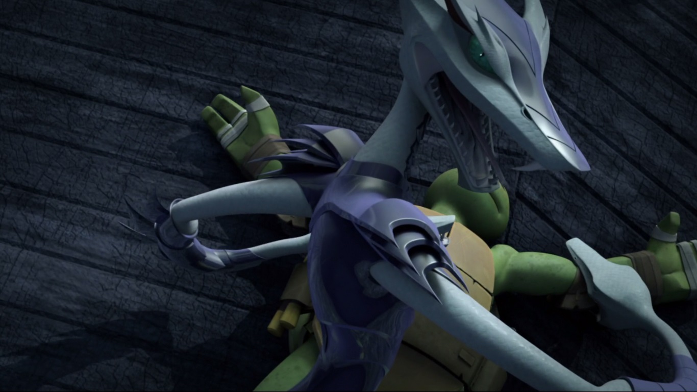 Le serpent ne quittait pas New York pour autant. Alors qu’elle chassait des souris pour se nourrir, elle se fit capturer dans une cage. Bebop et Rocksteady étaient enfin parvenus à l’amener à Shredder. Ce dernier lui promettait de lui rendre son apparence humaine.
