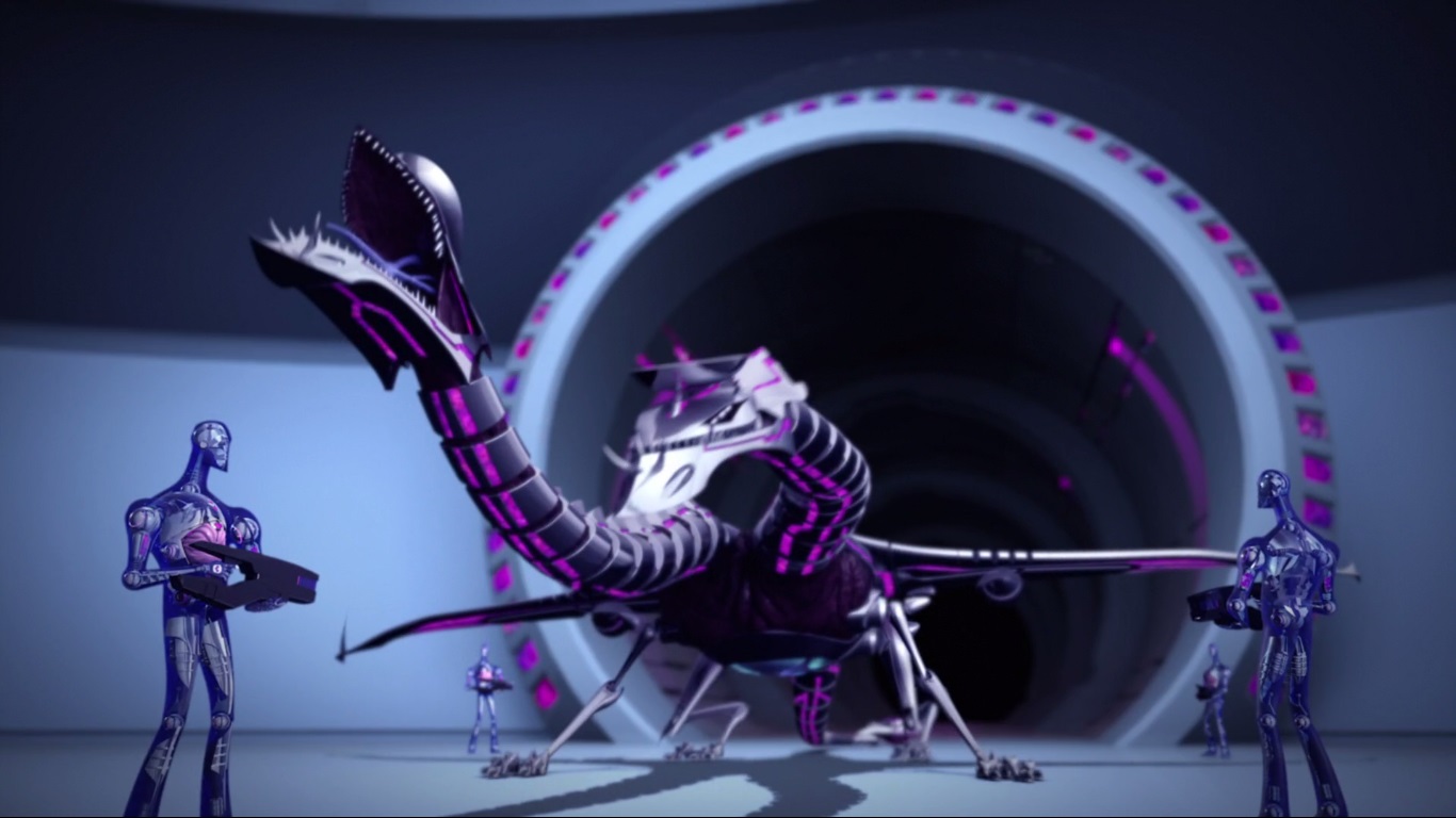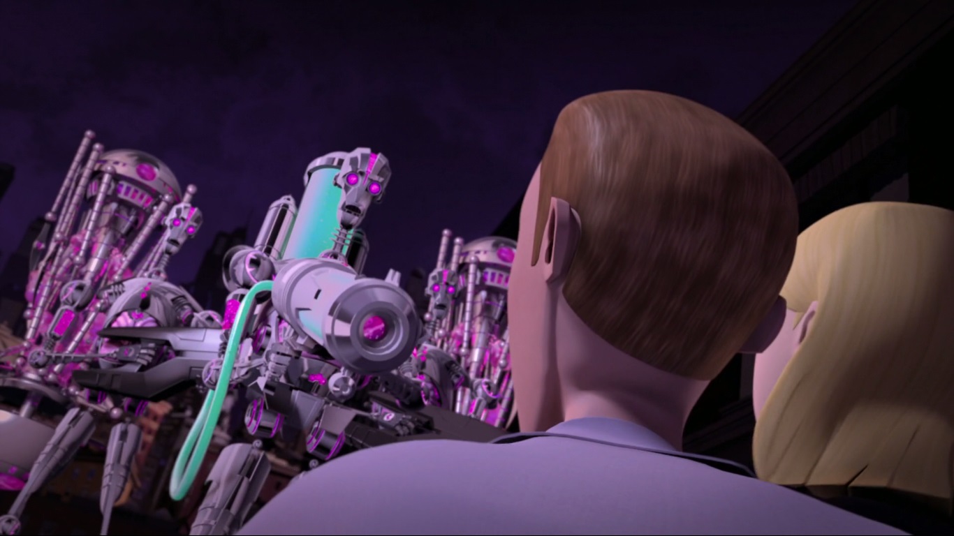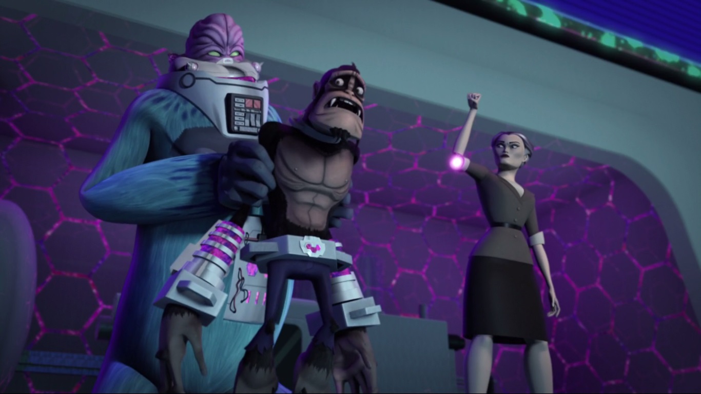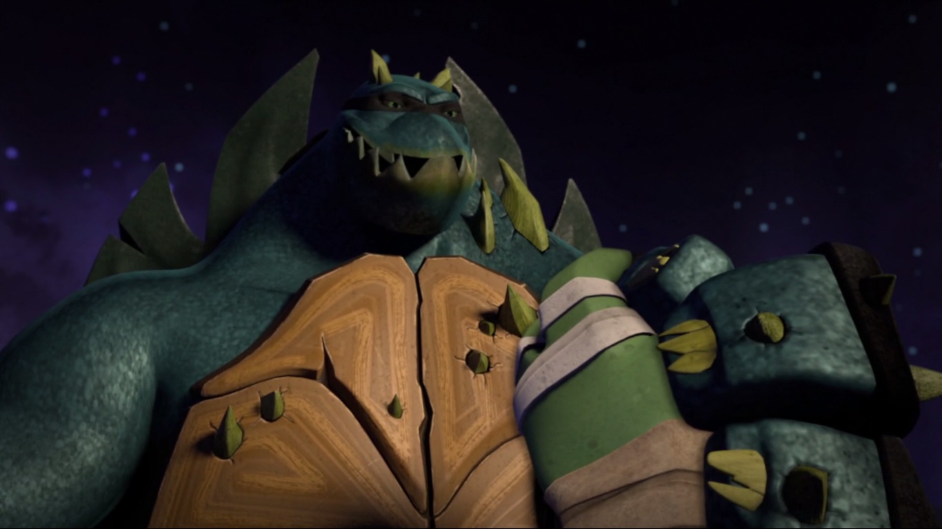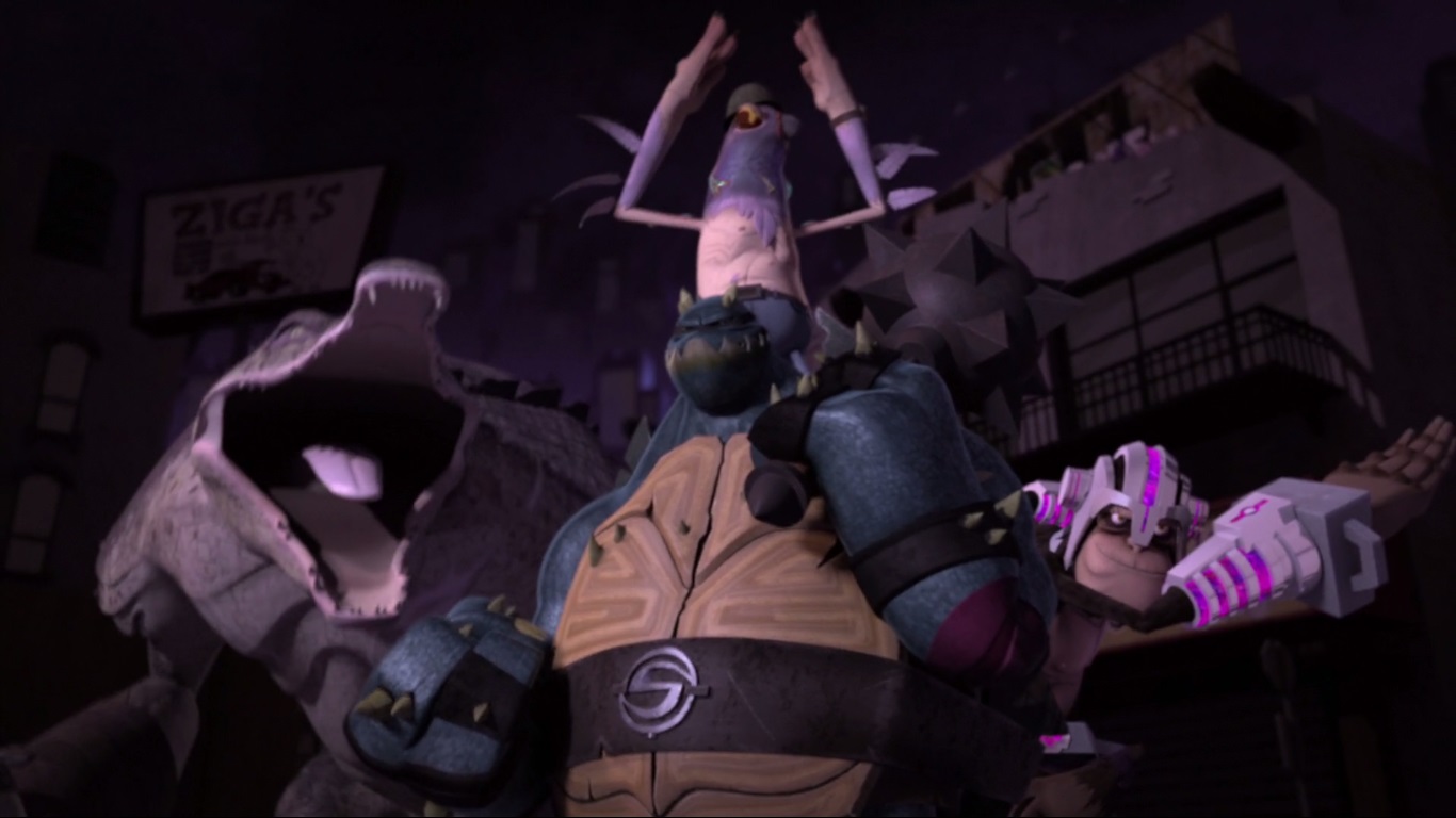 Bien sûr, les deux leaders étaient farouchement opposés à l’idée de faire équipe. Les extraterrestres avaient l’intention d’envoyer un missile rempli de mutagène afin de transformer la Terre entière. Les esprits s’échauffaient entre les deux équipes jusqu’à ce que les kraangs fassent irruption dans le hangar. Le lieu était assiégé par les envahisseurs, un biotroid à leur tête.