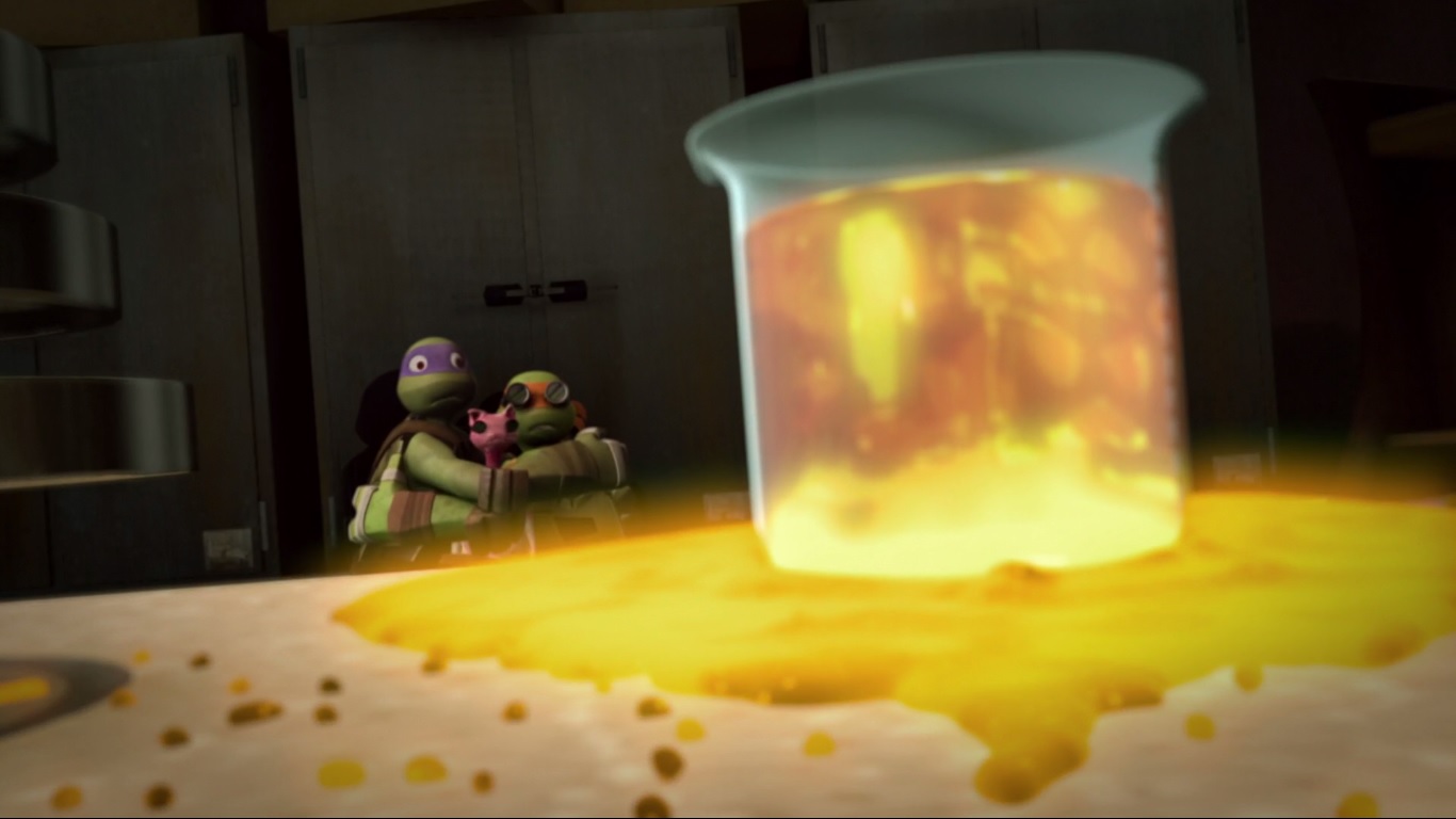 C’était décidé, Michelangelo se lançait dans la conception du rétro-mutagène ! Dans cette mission périlleuse, il était secondé par Ice Cream Kitty. C’est alors que Donatello entrait dans son laboratoire, venant voir ce qui l’avait tiré de son sommeil. Voyant son frère faire de la chimie il commençait à paniquer. Cela faisait des mois qu’il travaillait à la conception du rétro-mutagène. Ses recherches risquaient de se faire balayer en un rien de temps par une tortue inexpérimentée… Il s’empressait de lui reprendre les flacons des mains, mais une goute s’échappait de l’un des béchers et tomba dans le mutagène. La réaction était plutôt violente au début, projetant les tortues contre le mur de la pièce, puis la solution prit une couleur orangée. Alors que les deux frères s’attendaient à une explosion, un petit fumet sortait du bocal. C’était terminé.