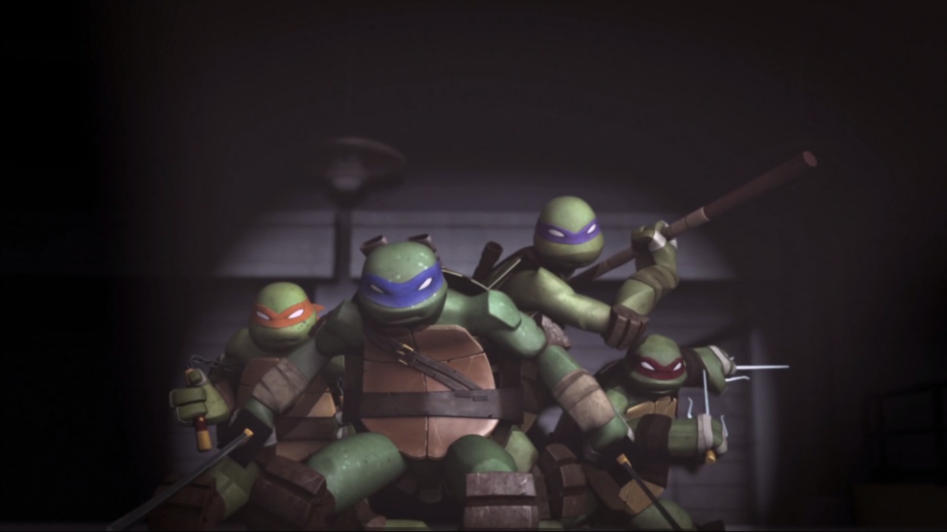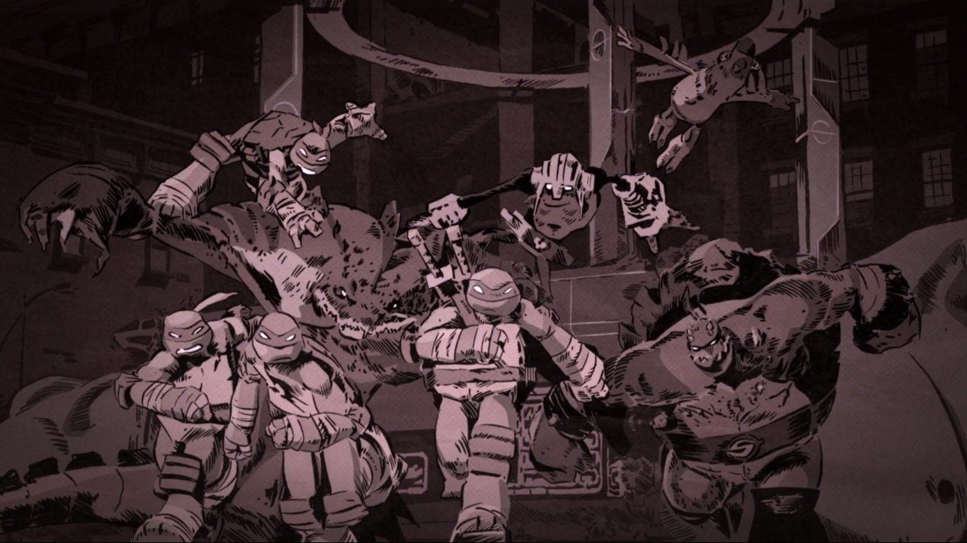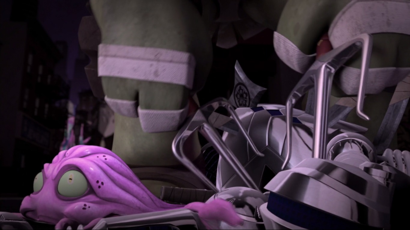 Arrivant sur le toit d’un immeuble, le scientifique de l’équipe présentait à ses frères un château d’eau. Sa dernière invention ! Les autres tortues se moquent de lui, ne se doutant pas que quelque chose de génial y était dissimulé. Malheureusement il ne pouvait aller au-delà dans sa démonstration, un véhicule furtif kraang survolait les environs. Non loin de là, les kraangs se trouvaient sur la piste d’humains qu’ils délogeaient. S’apprêtant à les changer en mutants, l’un des kraangdroid fut frappé par les saïs de Raphael. Un combat de rue éclatait alors. Très vite, les tortues étaient dépassées par le nombre et encerclées.