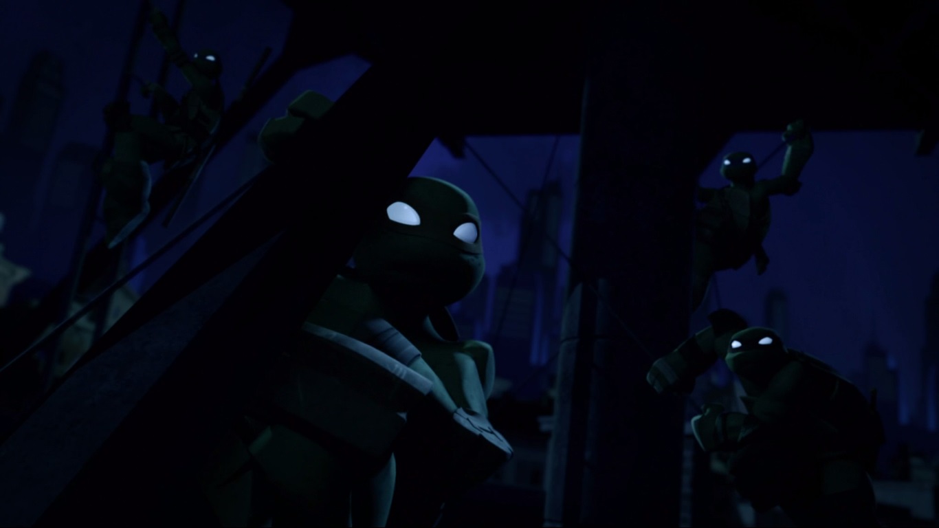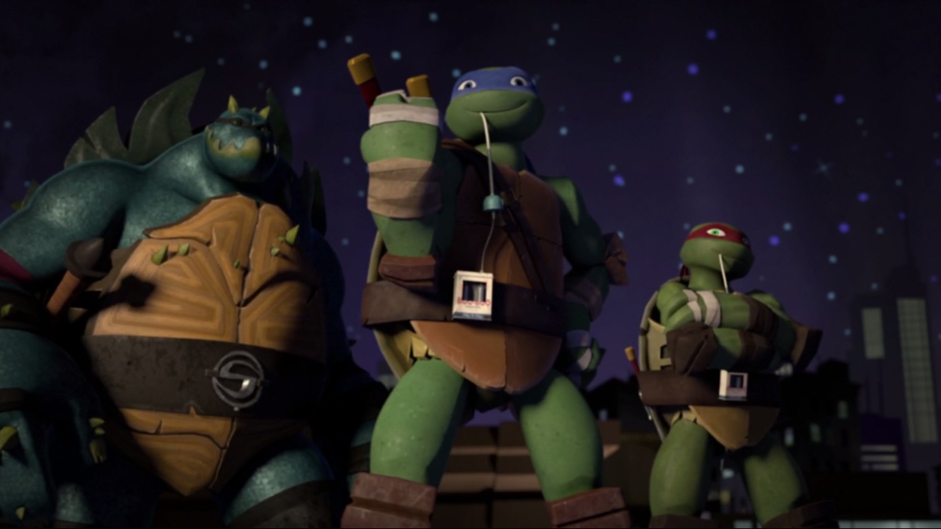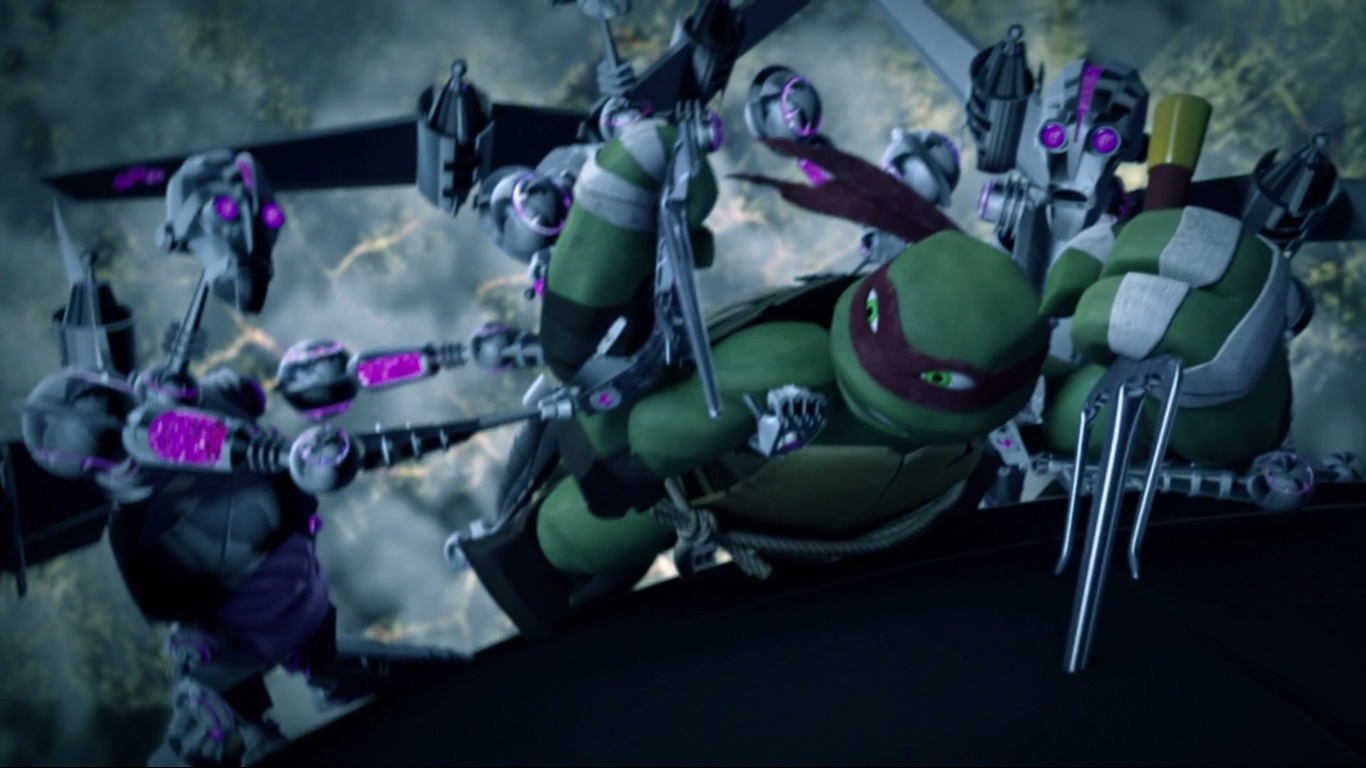 Arrivant sur le toit d’un immeuble, le scientifique de l’équipe présentait à ses frères un château d’eau. Sa dernière invention ! Les autres tortues se moquent de lui, ne se doutant pas que quelque chose de génial y était dissimulé. Malheureusement il ne pouvait aller au-delà dans sa démonstration, un véhicule furtif kraang survolait les environs. Non loin de là, les kraangs se trouvaient sur la piste d’humains qu’ils délogeaient. S’apprêtant à les changer en mutants, l’un des kraangdroid fut frappé par les saïs de Raphael. Un combat de rue éclatait alors. Très vite, les tortues étaient dépassées par le nombre et encerclées.
