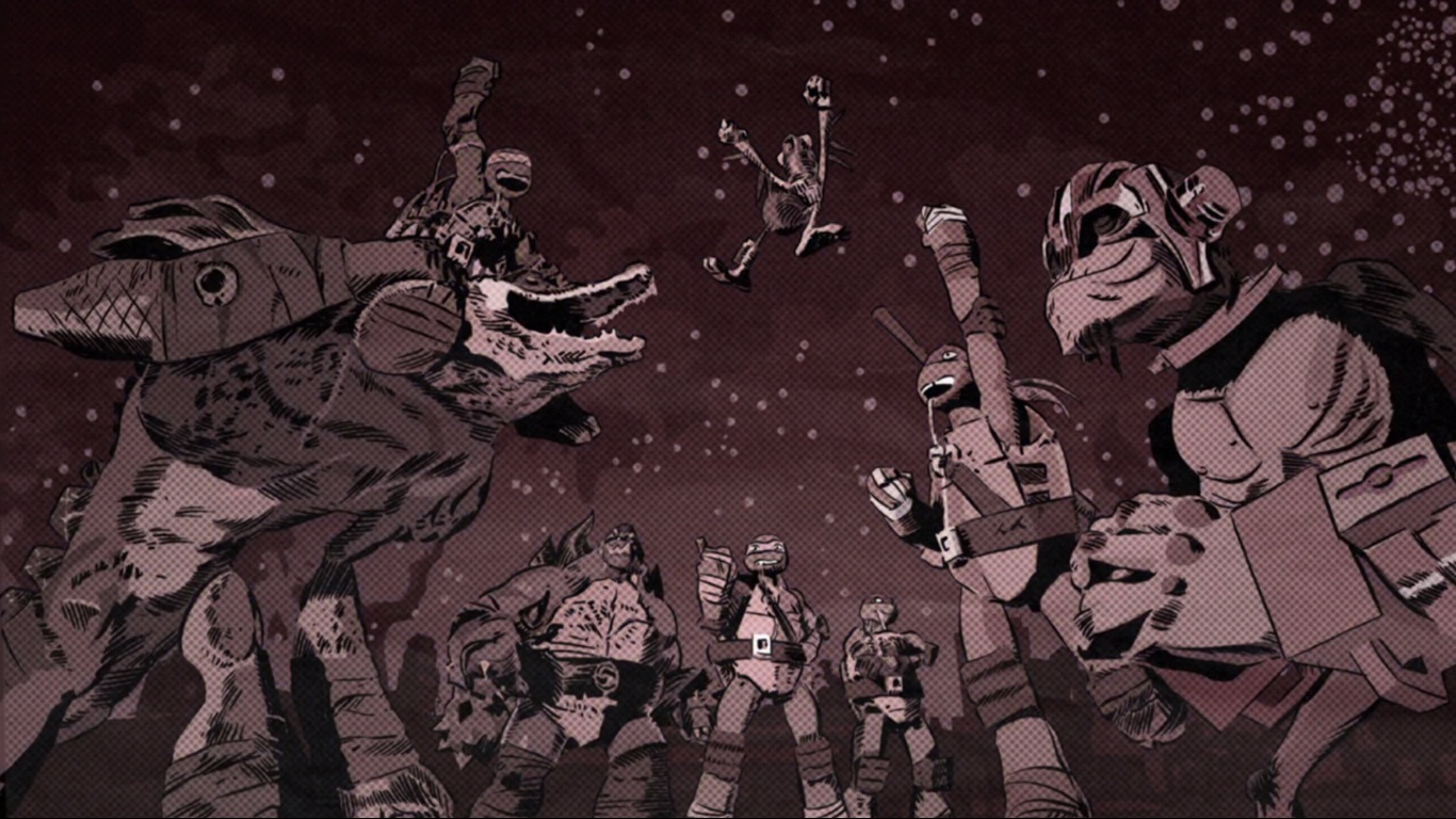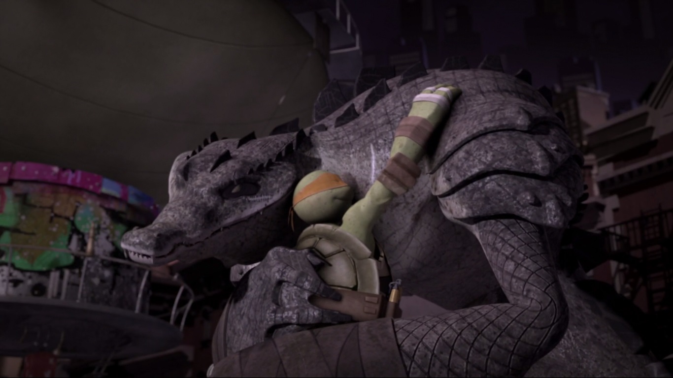 April et Casey sortaient de la pizzeria désaffectée avec Kurtzman, portant un bandage au bras droit. À cet instant l’adolescente apercevait son père, déboussolé. Elle lui sautait dans les bras. Les tortues étaient fières de ce qu’elles venaient d’accomplir. Une nouvelle victoire majeure contre les kraangs ! Bientôt, les Mighty Mutanimals les rejoignaient. Slash félicitait Leonardo, qui reconnaissait à son tour l’efficacité de la tortue géante au commandement de sa